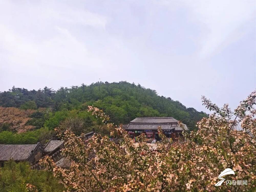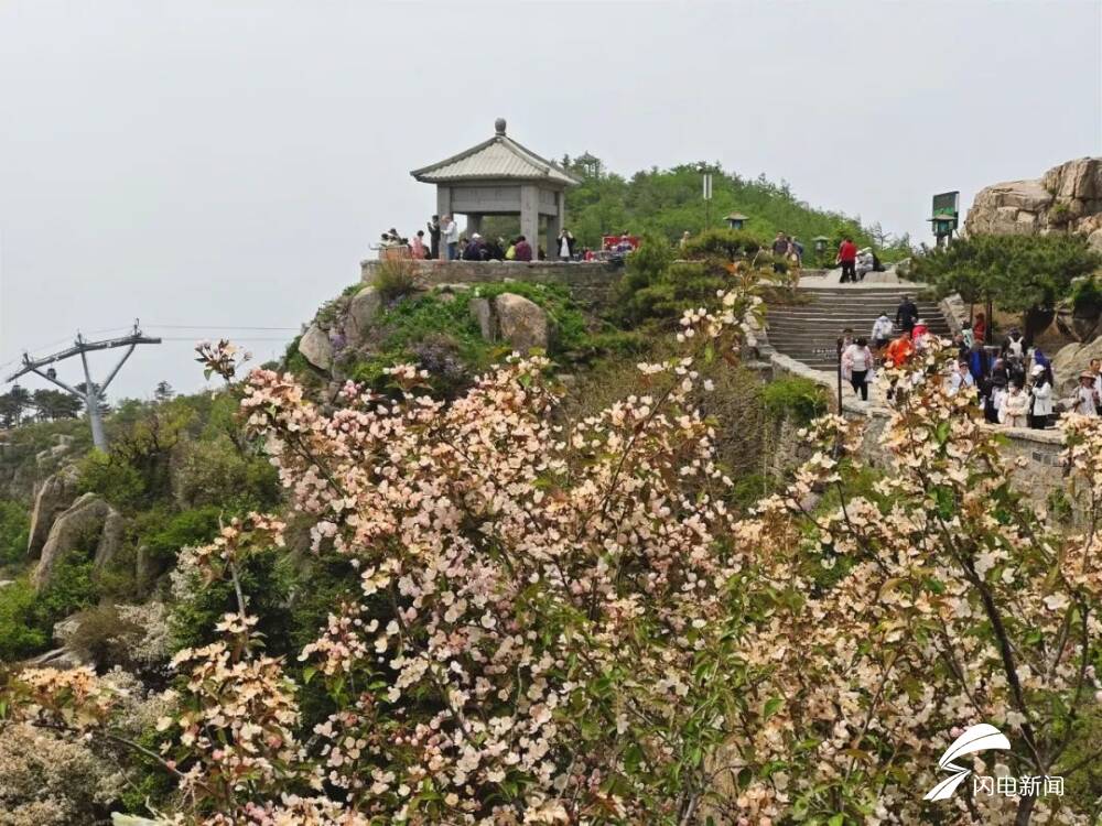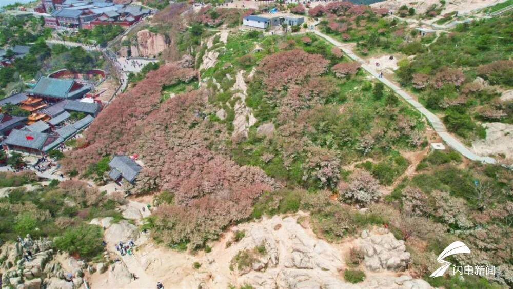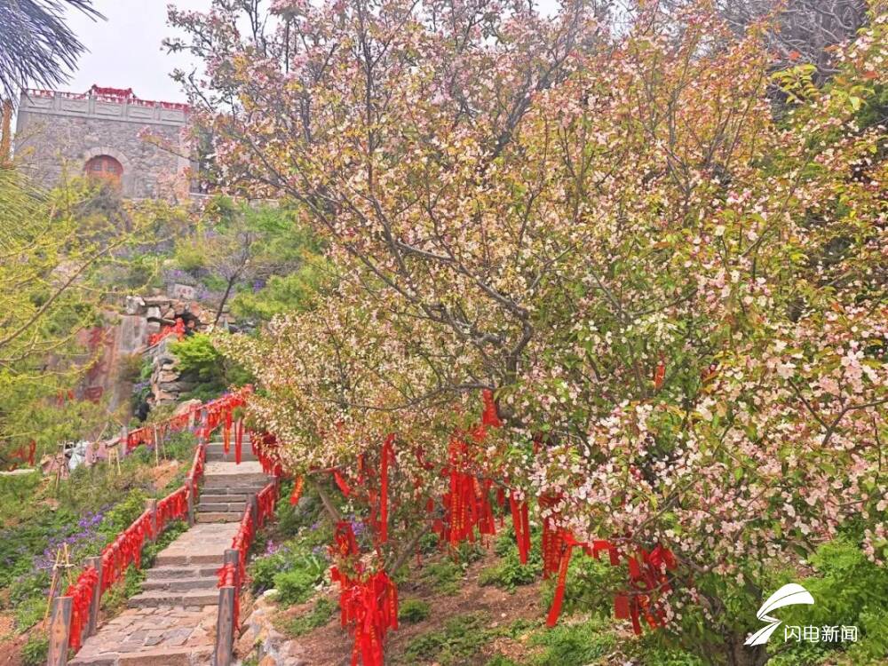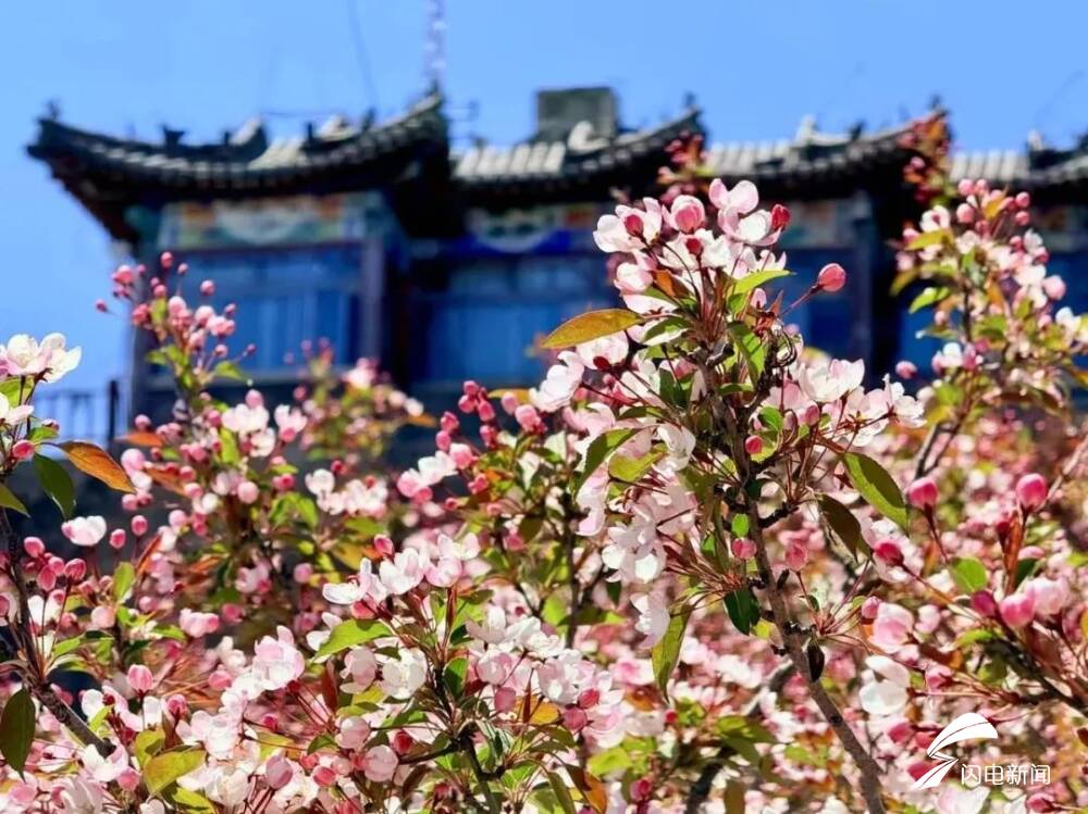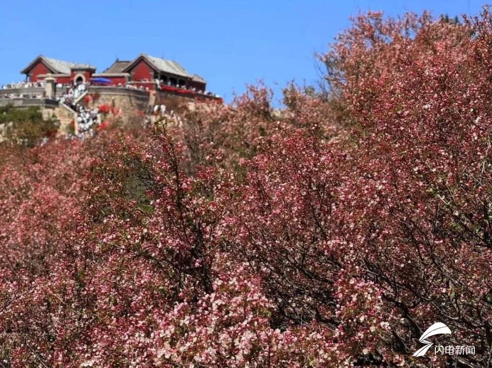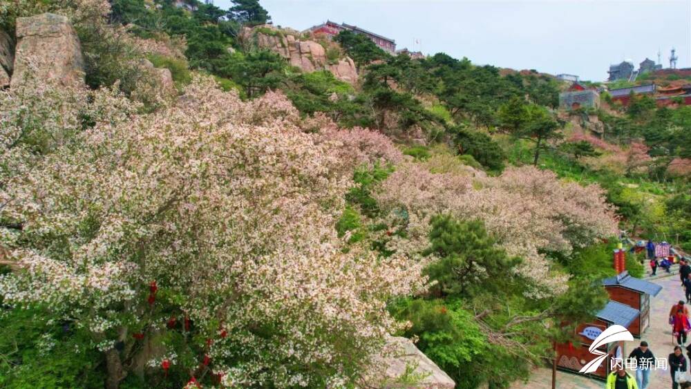 齐鲁网·闪电新闻5月8日讯 初夏时节,岱顶海棠进入盛开期,粉白色花朵缀满枝头,在青山绿树间铺就一片梦幻花海,微风拂过,花瓣纷飞,与古朴的庙宇、石刻相映成趣。
