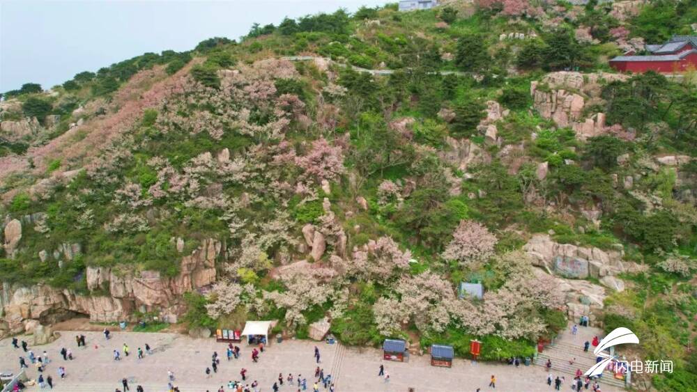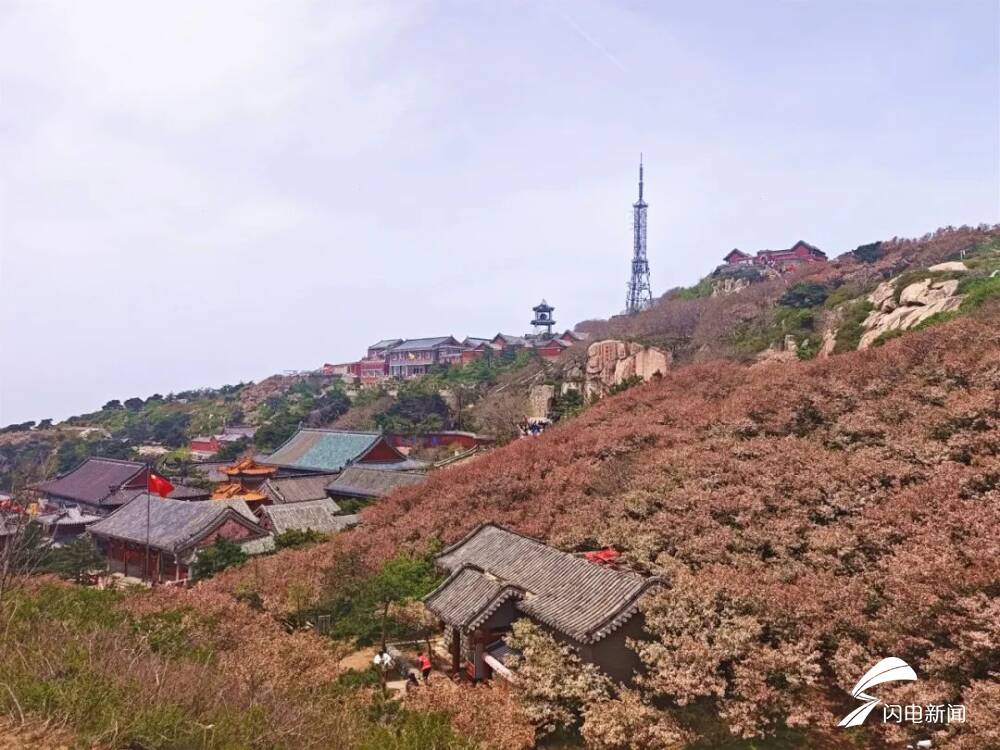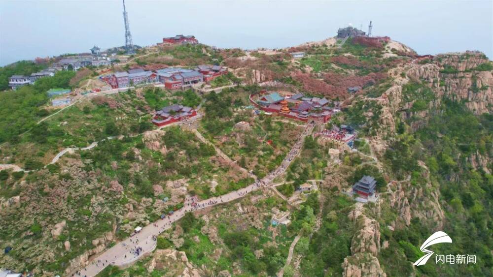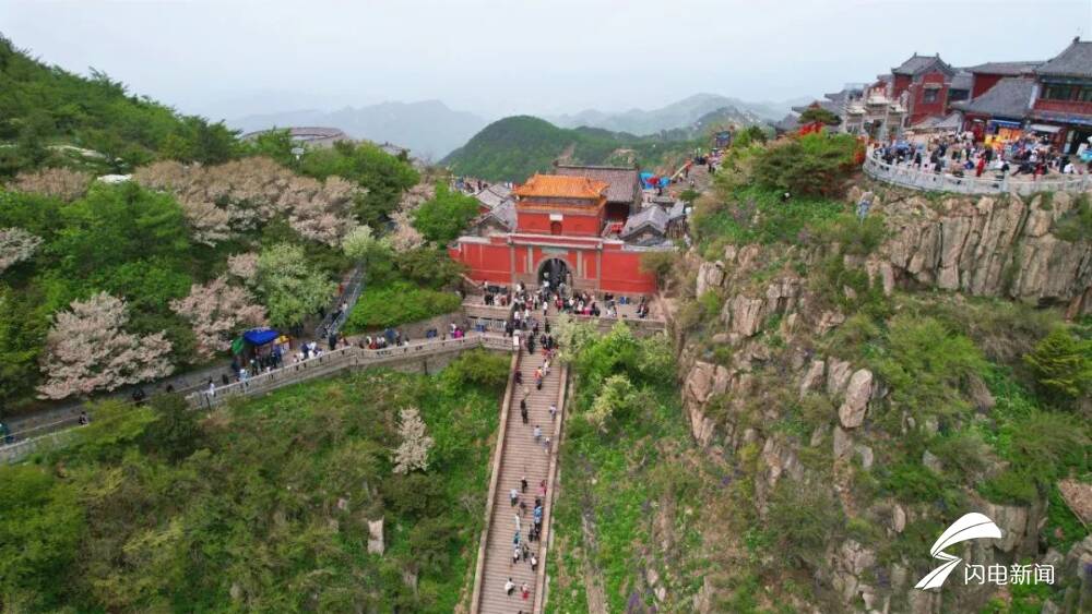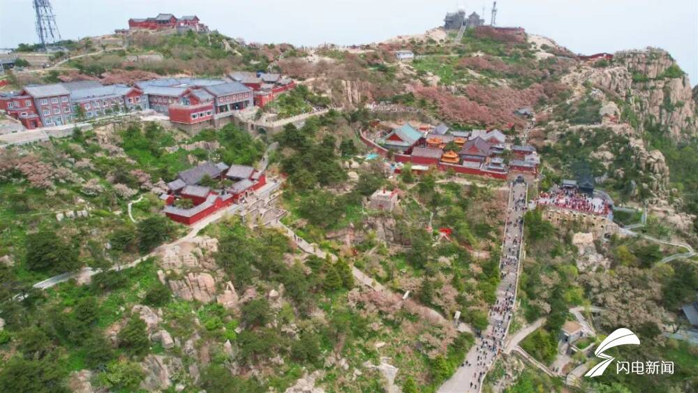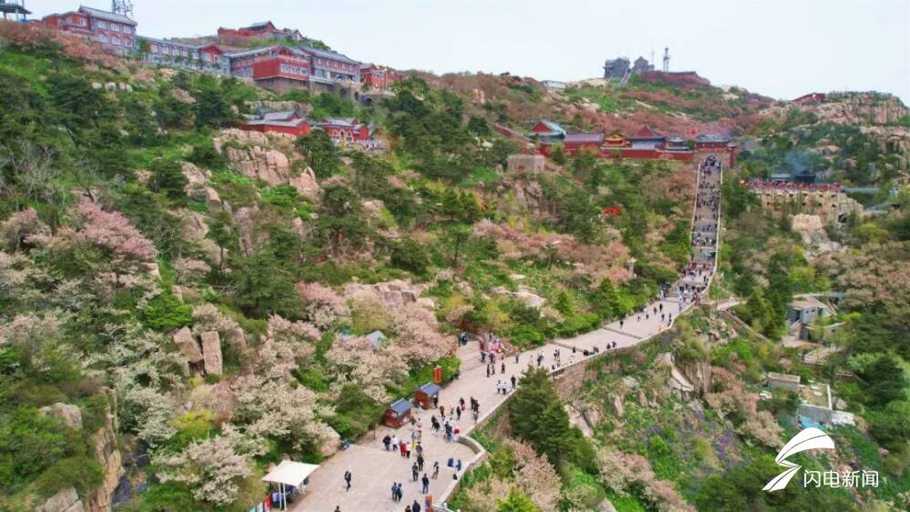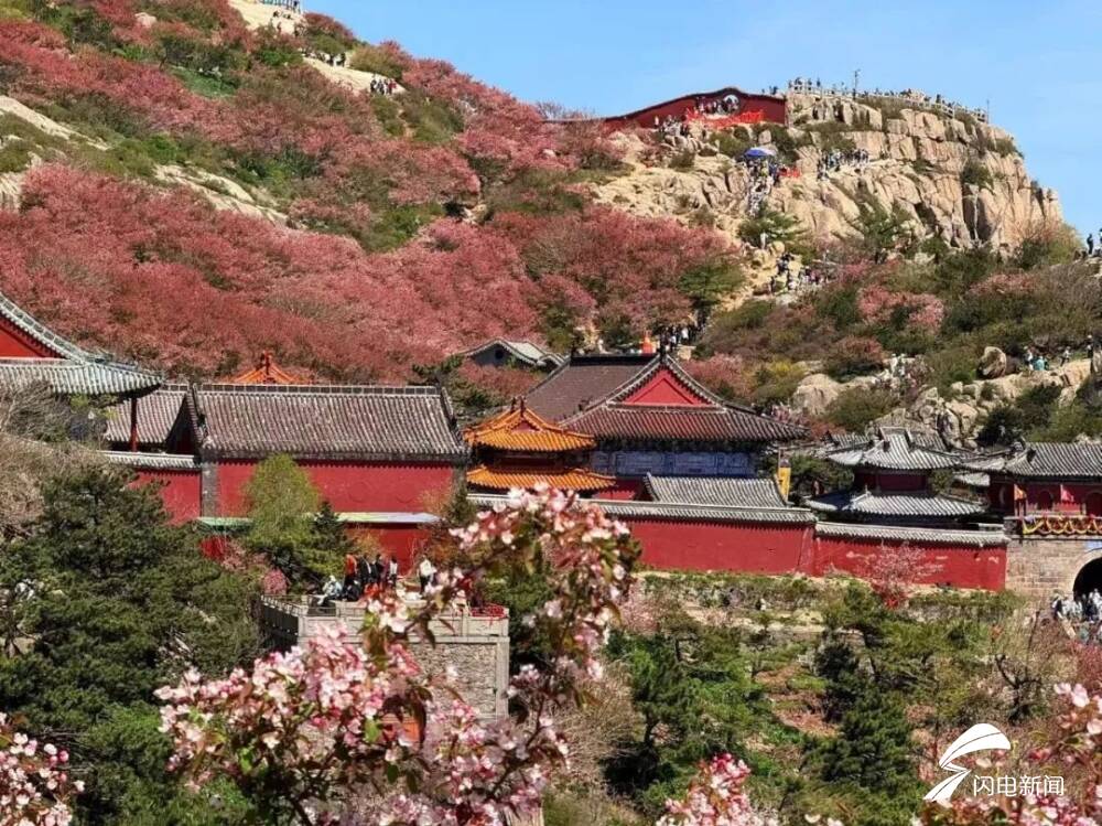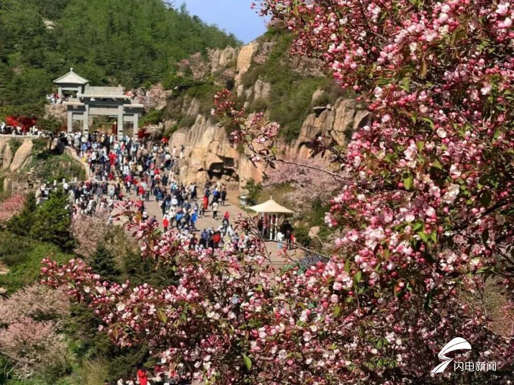 齐鲁网·闪电新闻5月8日讯 初夏时节,岱顶海棠进入盛开期,粉白色花朵缀满枝头,在青山绿树间铺就一片梦幻花海,微风拂过,花瓣纷飞,与古朴的庙宇、石刻相映成趣。