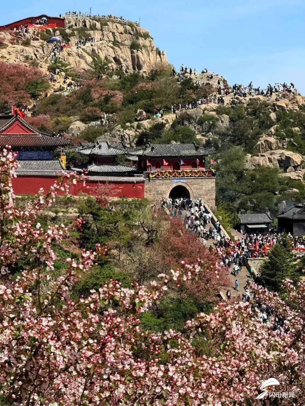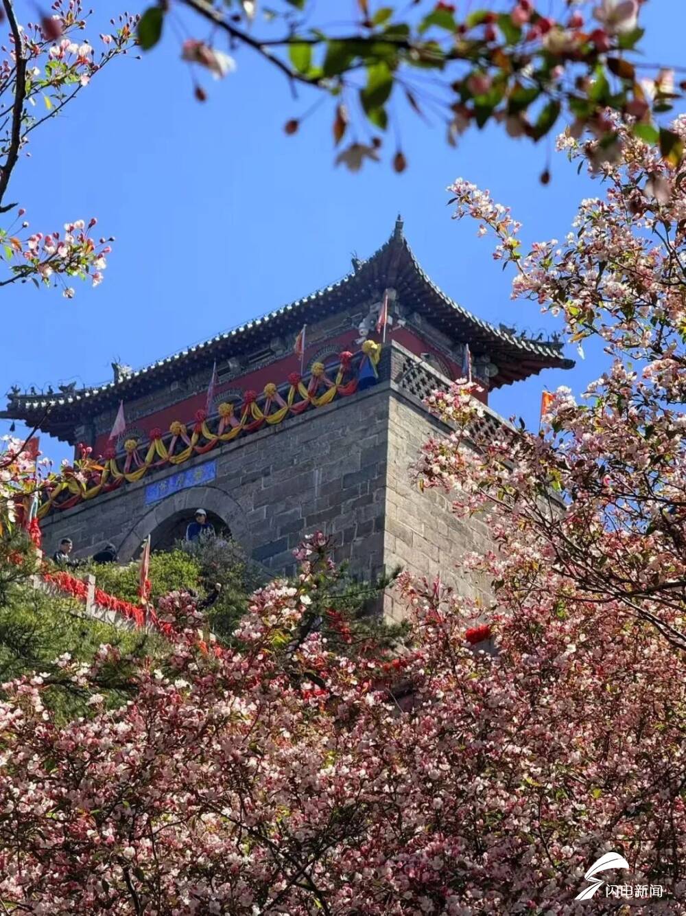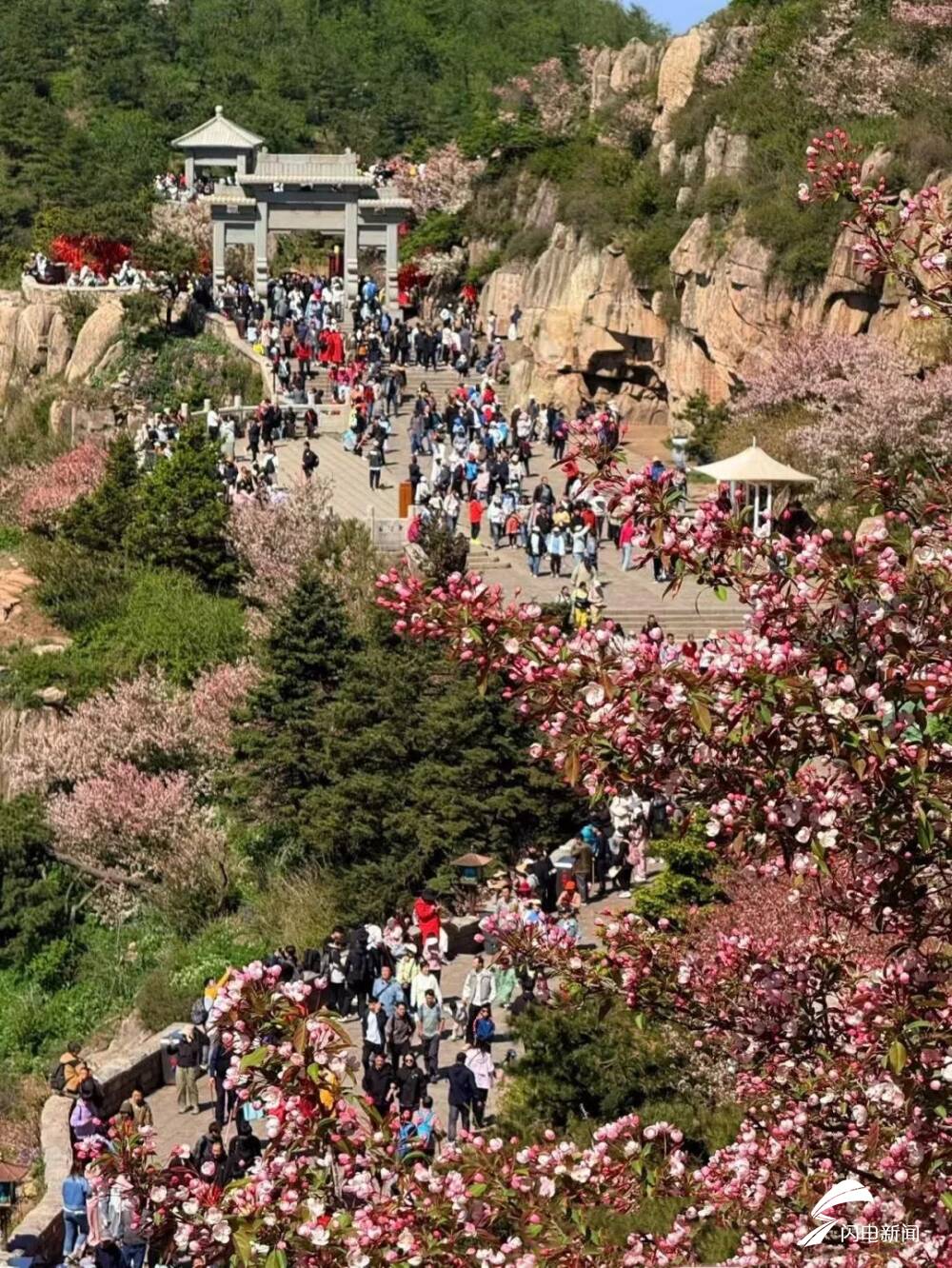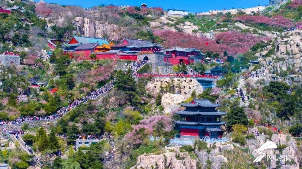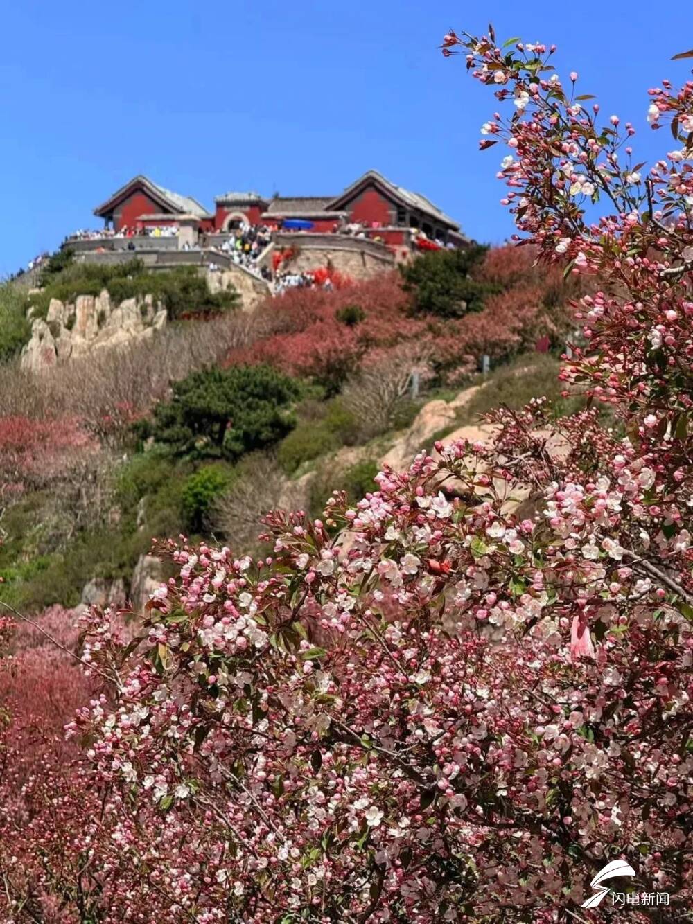 齐鲁网·闪电新闻5月8日讯 初夏时节,岱顶海棠进入盛开期,粉白色花朵缀满枝头,在青山绿树间铺就一片梦幻花海,微风拂过,花瓣纷飞,与古朴的庙宇、石刻相映成趣。