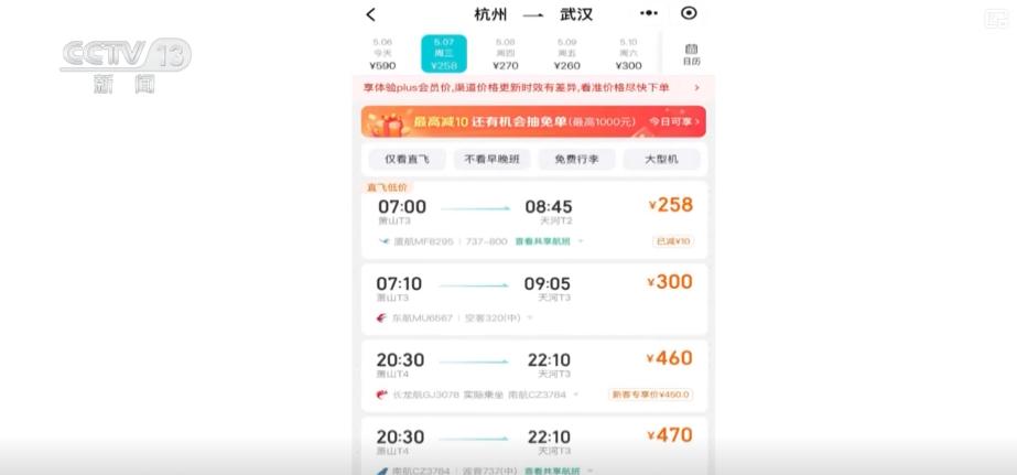 "五一"假期刚过,多家在线旅游预订平台的机票价格普遍下降。例如,从浙江杭州飞往成都、武汉、北京等地的单程机票最低仅需300多元。在杭州萧山国际机场,有不少旅客选择了在此时错峰出游。