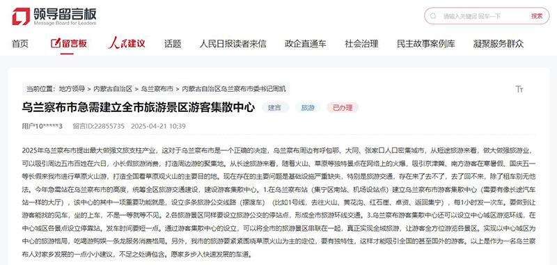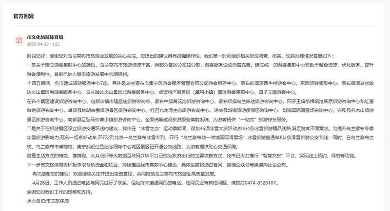 “您提出的建议具有很强操作性,我们第一时间组织相关单位调查、核实。”收到留言后,乌兰察布市文化旅游体育局回复网友建议,关于建立游客集散中心,乌兰察布市旅游资源丰富,但部分景区分布较分散,游客服务设施仍需完善。建立统一的游客集散中心有助于整合资源、优化服务、提升游客便利性,目前已纳入乌兰察布市旅游发展中长期规划。