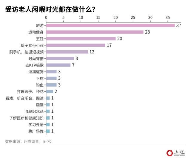 除旅游之外,闲暇时光里,运动健身、烹饪,在老人们的选择中位列前三。这些选择偏重享乐,对经济收入也有一定要求,更重要的是体现了对个人价值的重视。