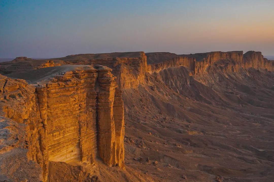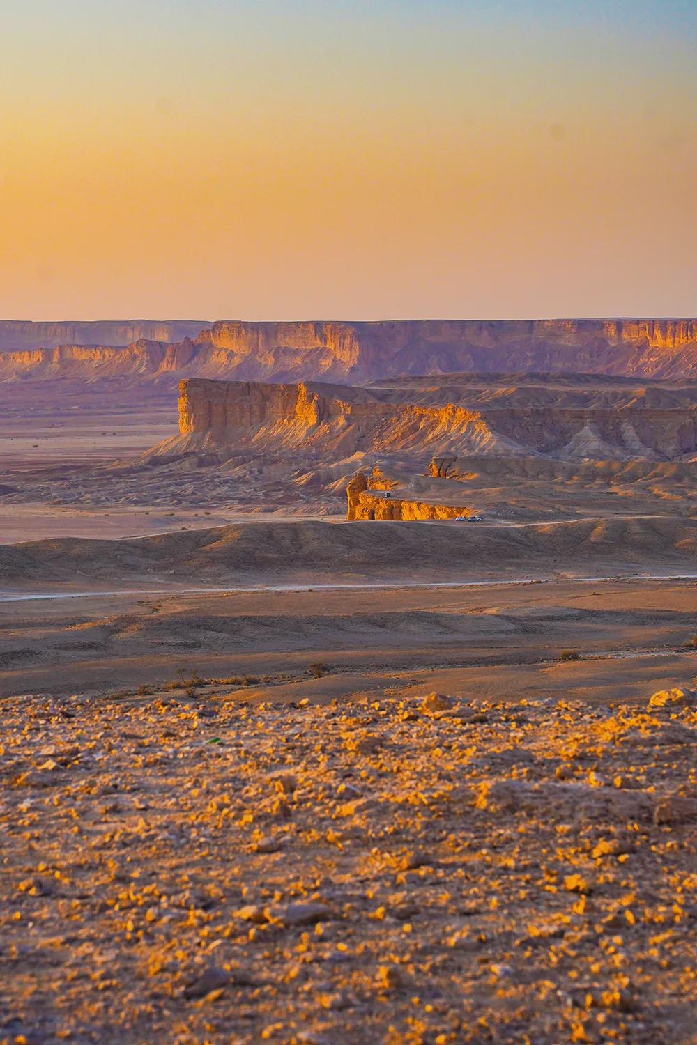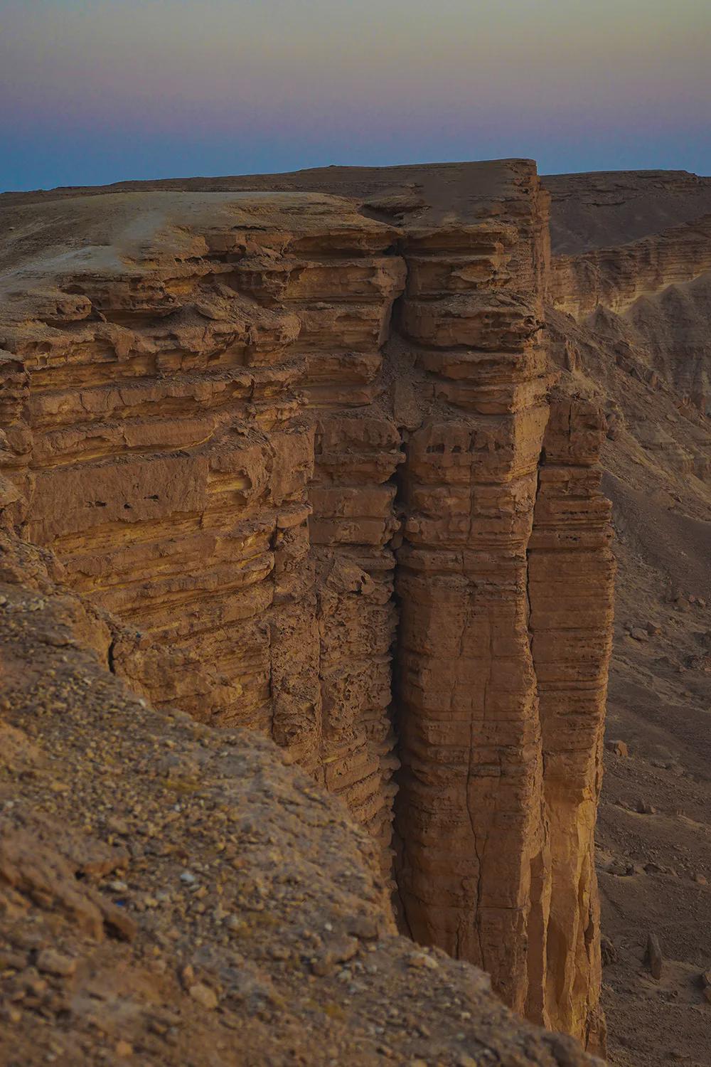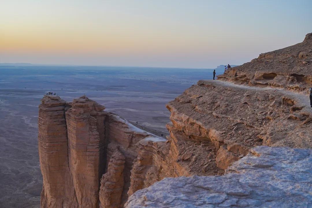 世界之崖,意思是世界的尽头,其实是沙特利雅得图瓦克山脉的尽头。绵延800多公里的图瓦克山脉,在这里戛然而止,形成一片落差近30米左右的断崖。这里距离利雅得城区大约200公里左右。