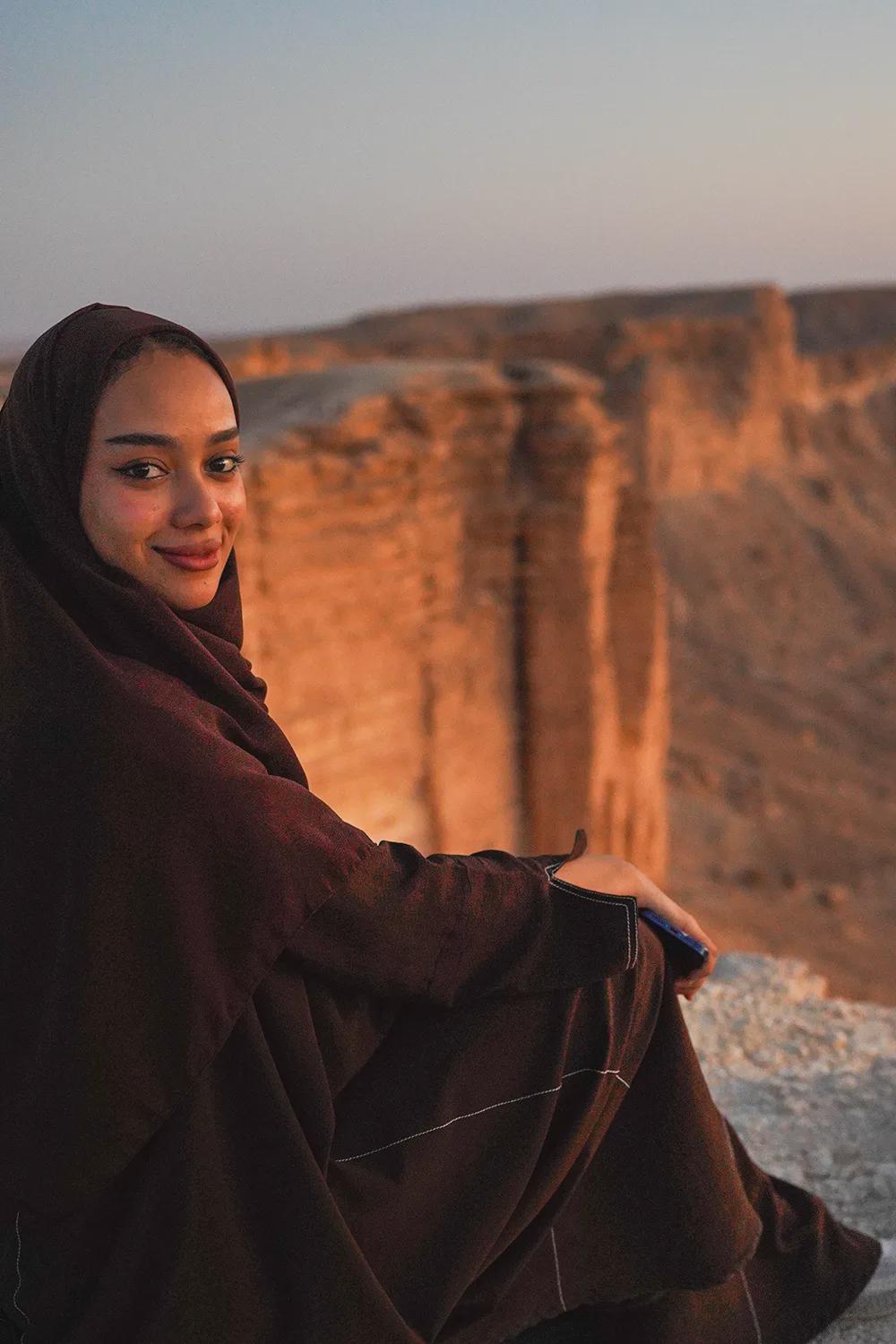太阳落山后,人群便陆续开始返程了,来都来了,也不能空手而归,胆大的人走到最高最窄的地方拍照去了,我们恐高,天又黑得很快,也不敢走太远。沙特人对中国人十分热情,有个沙特美女让我帮她拍了照片,其实,沙特的女人个个落落大方,长相极美,近几年政府也开始陆续给她们安排工作,思想已不再禁锢。