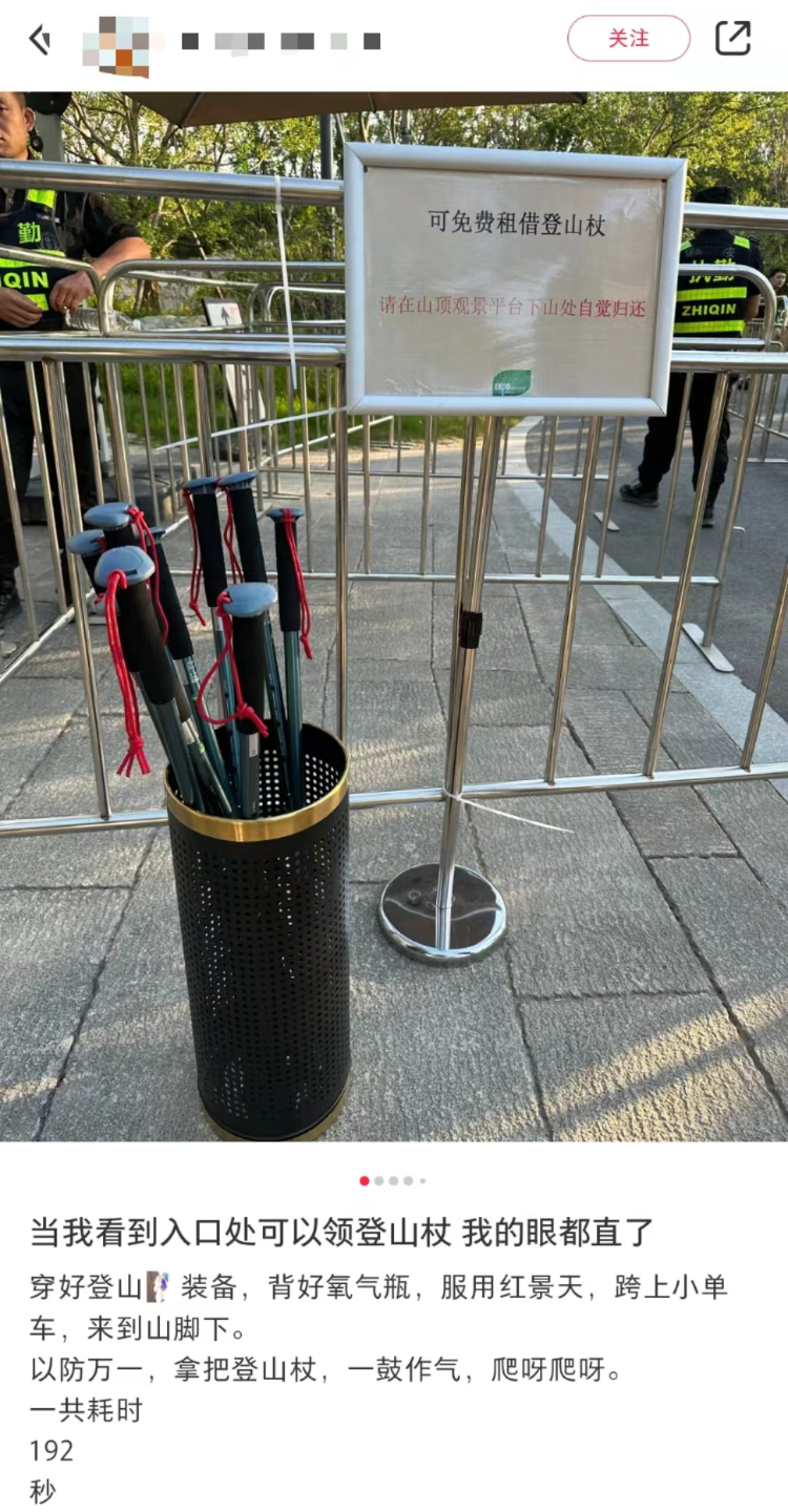 关于登山杖,记者在现场看到,需求量不大,但不是完全没有,今天老年游客居多,有老年人第一次来,不知道上山需要爬多久,以防万一,先拿一根登山杖再说。而在此前拍摄的照片中,也的确有中青年游客手拿登山杖在爬山。