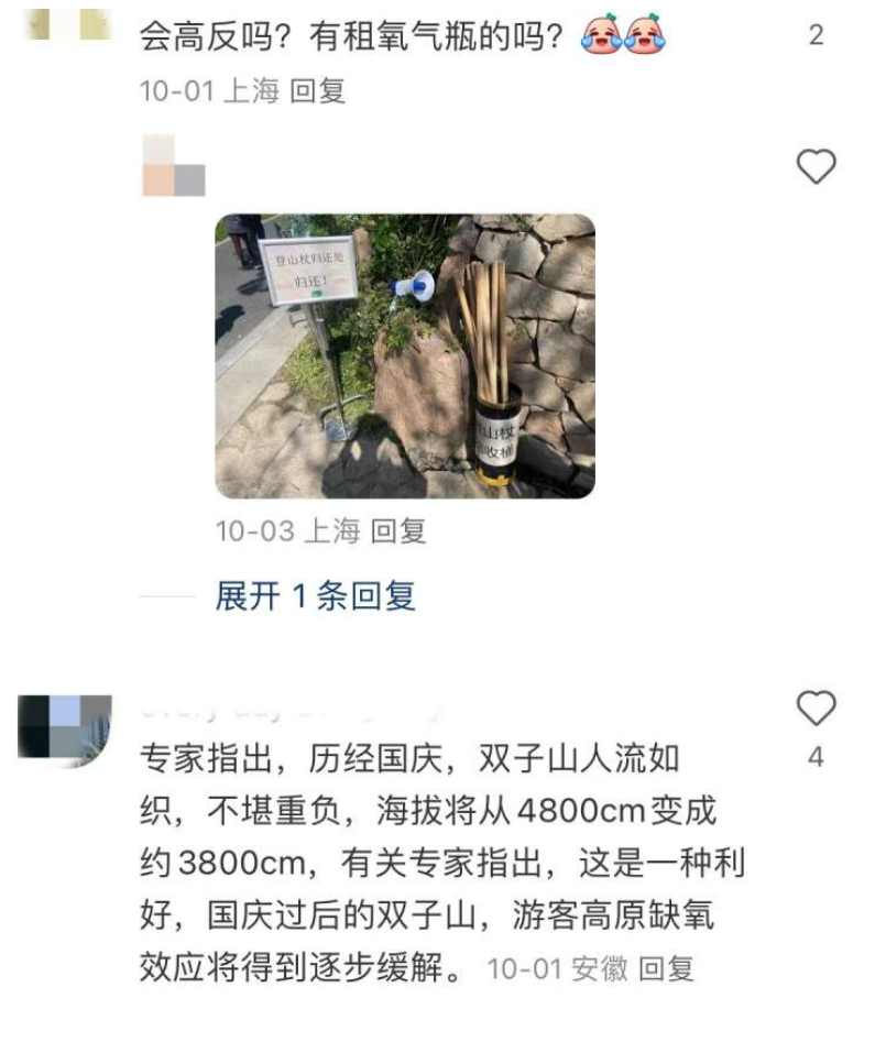 推文标题为《重阳节,登上海拔4800厘米的双子山需要……》,其中写道:要不要喝红景天?一般我们不建议。因为山上风光无限,专治“班味”,专治大脑缺氧;要不要带登山杖?嘿嘿,贴心的我们已经为你准备好了!记得下山随手归还哦~