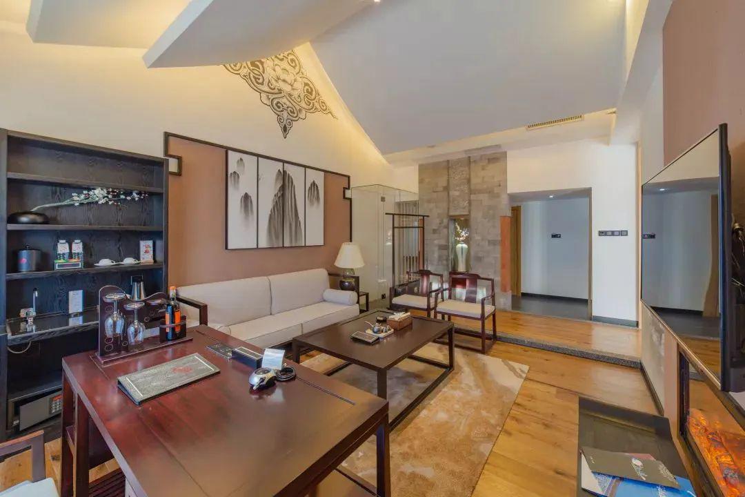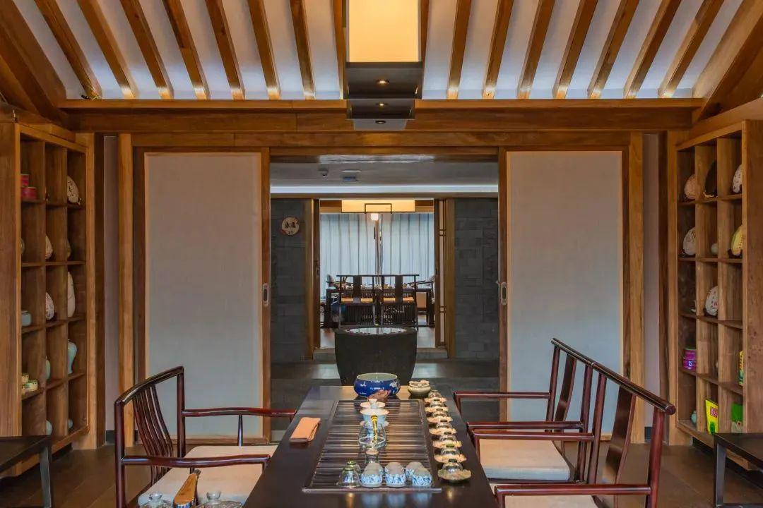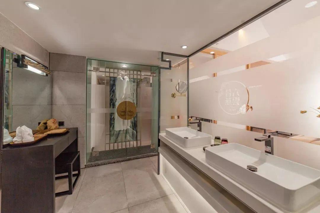 六合云燕设计将新中式风格与白族传统民居风格融合,设计师匠心独运地解构了“三坊一照壁”“四合五天井”等白族传统建筑形制,以现代手法演绎“六合同春”的吉祥寓意,并在空间中融入扎染、木雕等元素。