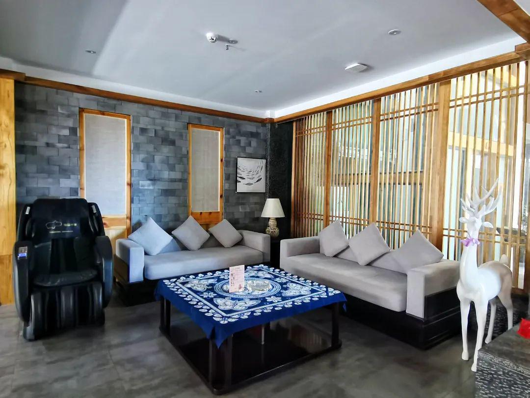 公区内随处可见布置得雅静的桌椅沙发,任意找个角落坐着晒太阳、喝茶,都十分惬意。转角处每一处镂空木窗、摆件、绿植,看似漫不经心,却流动着一丝丝禅意。手凿花纹的地板、老船木制成的家具……青瓦石墙,庭院深深,酒店各处设置细节满满。宽大的屋顶露台,视野极尽开阔,成为私享“风花雪月”的绝佳点。