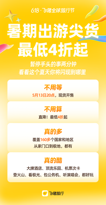 5月13日晚8点,2025年飞猪“618”现货开售。活动商品价格直降,最低4折起。