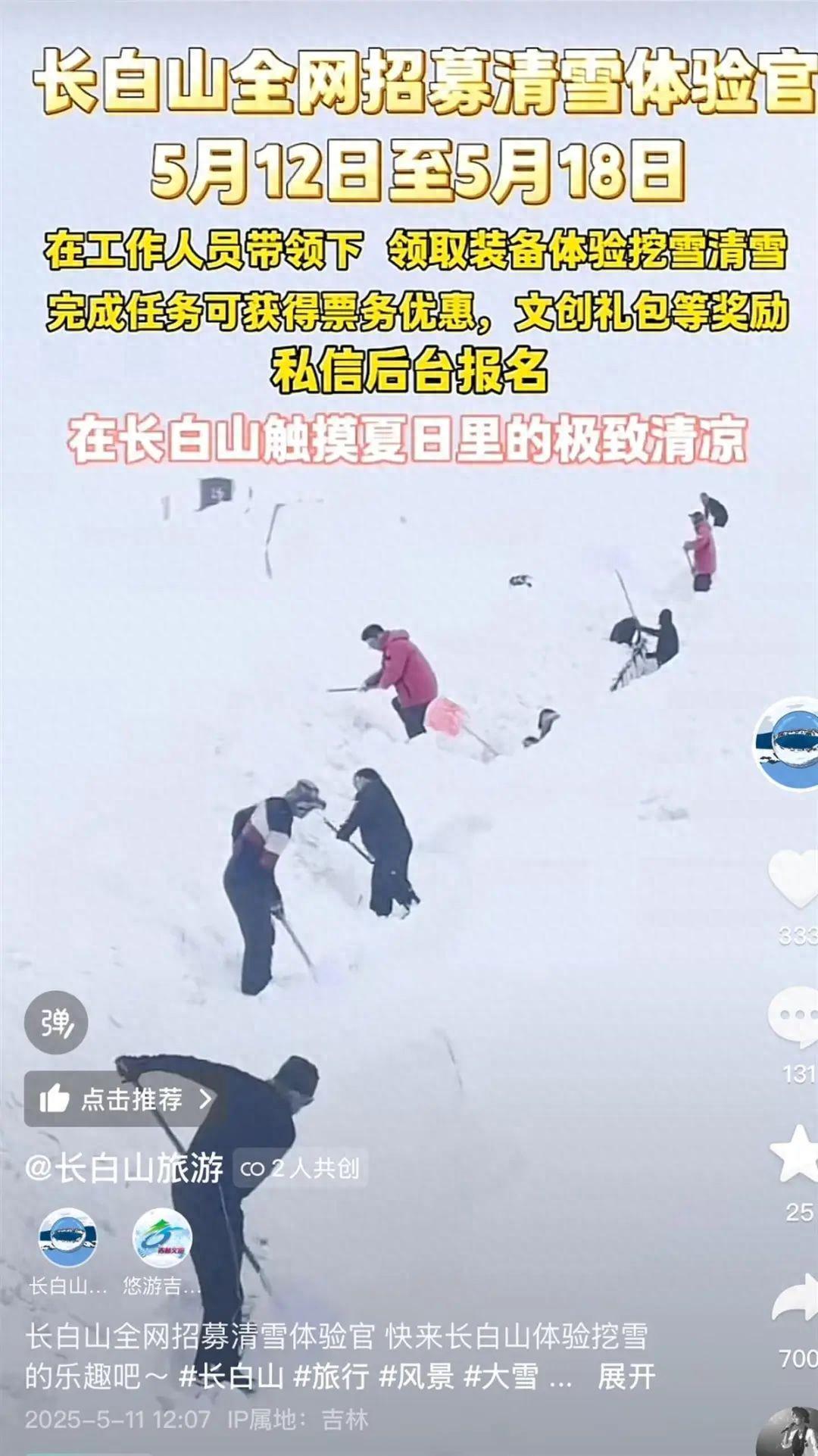 5月12日至18日,吉林长白山景区全网招募清雪体验官。对此,有网友戏称“免费劳动力”,也有网友表示想体验。