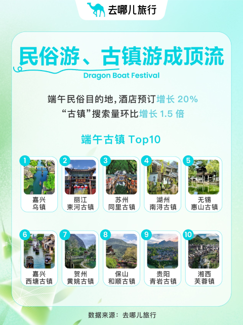 去哪儿数据显示,截至5月16日,今年端午节期间,平台上热度最高的古镇TOP10为嘉兴乌镇、丽江束河古镇、苏州同里古镇、湖州南浔古镇、无锡惠山古镇、嘉兴西塘古镇、贺州黄姚古镇、保山和顺古镇、贵阳青岩古镇和湘西芙蓉镇。