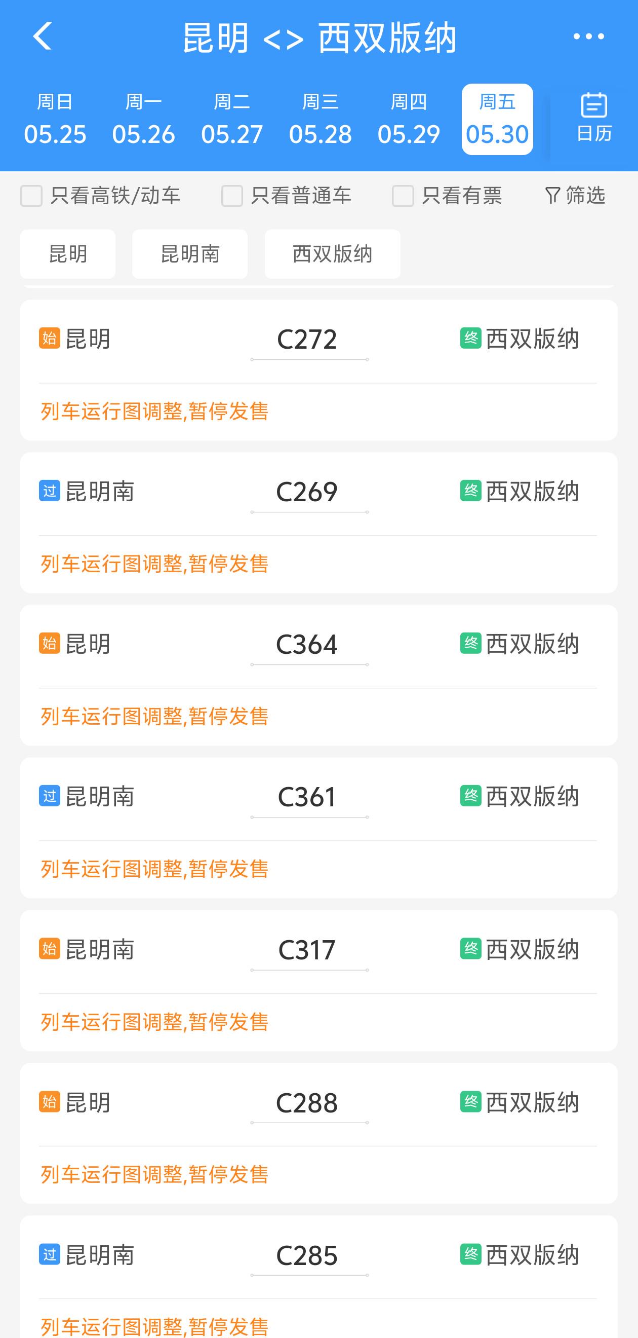 5月16日,端午前日(5月30日)火车票开售。开屏新闻记者从12306客户端查询获悉,5月30日下午昆明出发到省内多个城市的多趟车次车票已售罄,包括昆明至大理、曲靖、玉溪、普洱等。由于列车运行图调整,致西双版纳、普洱等城市的多趟列车运行图调整,暂停发售车票,有出行计划的旅客可提前关注。明日(5月17日)可购买端午假期首日的火车票。