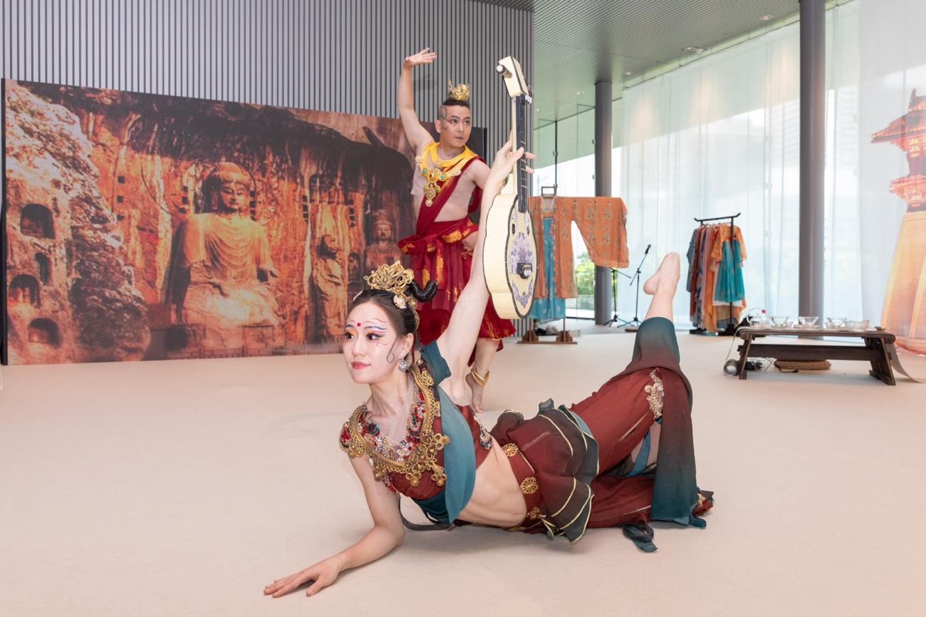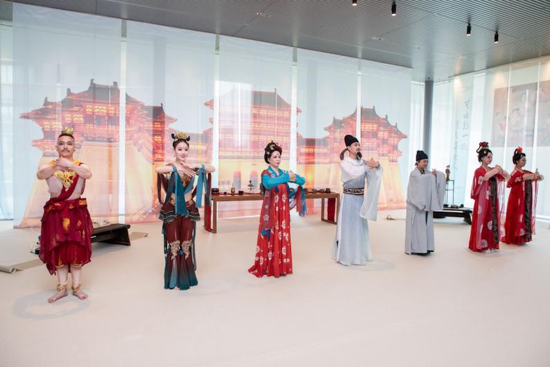 演出中,双人舞蹈《龙门金刚》惊艳登场,舞者以刚劲与柔美并融的姿态演绎唐代石刻中金刚力士和飞天仙子的风采,宛若盛唐石壁跃然而出。宫廷唐茶则是用法门寺地宫出土文物一比一复刻的14件宫廷茶器,依陆羽《茶经》所载之煎茶古法所制,再现盛唐茶礼之美。