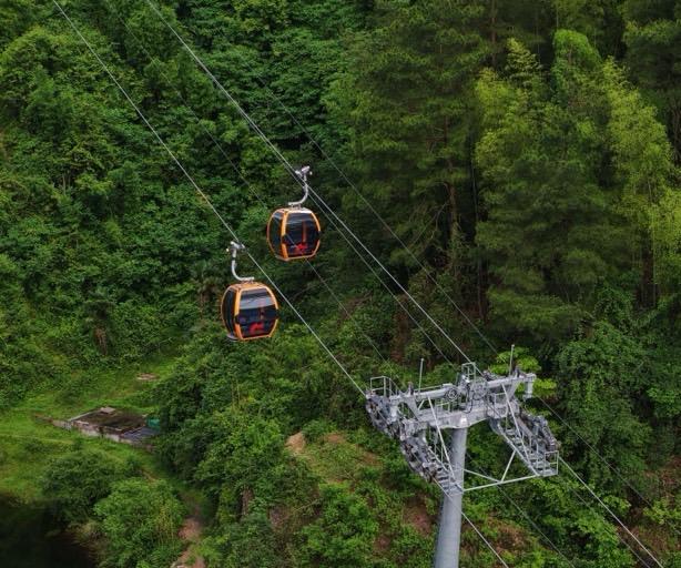 崀山八角寨主峰海拔高818米,是崀山景区的最高峰。山顶可观赏著名的“鲸鱼闹海”景观。2023年12月24日,八角寨索道提质改造项目开始施工,如今全新亮相。新索道采用全球顶尖的奥地利多贝玛亚集团D-Line型单线循环式脱挂抱索器吊厢客运索道系统,配备55个8人座全封闭全景式天窗客厢,全面提升乘坐舒适度与安全性。