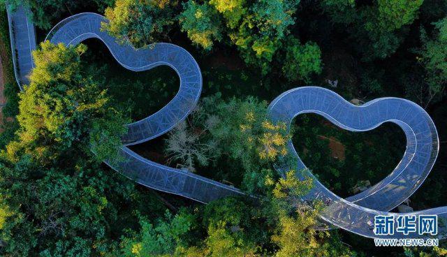 在昆明金殿附近,藏着一条2公里长的“爱心栈道”,该栈道的一段打了两个“结”,像极了两颗心交织。