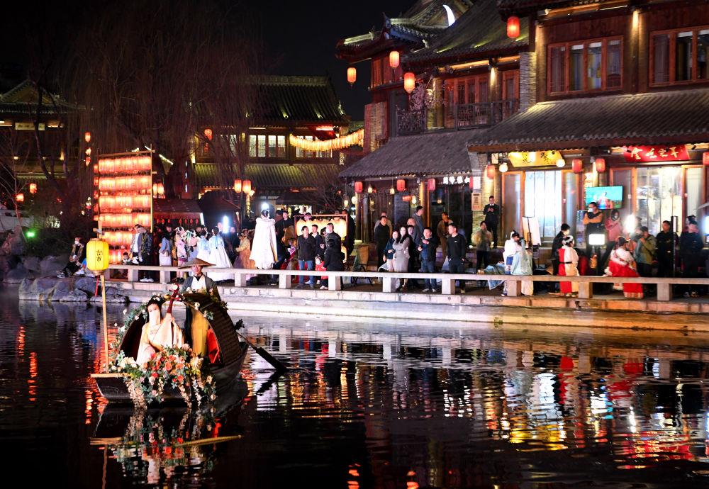 2023年2月28日,游客在洛阳洛邑古城游玩。洛邑古城精致的布景和各色表演吸引着众多游客。