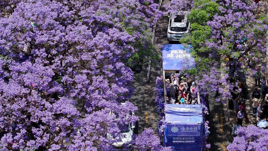 航拍蓝花楹美景,蓝花楹巴士穿梭其间(5月5日摄)。新华网 李浩 摄