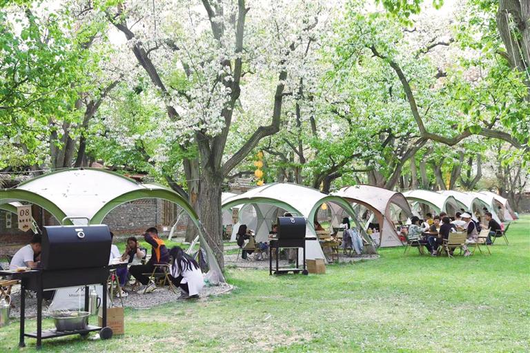 一家名为趣野星辰的梨园就是以露营风走红网络,收获了一大批热衷于露营的消费者。“我喜欢下雨的时候来这里露营,游客少,耳边只有雨声风声,是天然的自我疗愈场。在这里,消费的不仅是一顶帐篷、一顿野餐,更是一场浸润着梨花芬芳、黄河涛声与烟火人情的沉浸式体验。”网友李虫虫在社交媒体上发布了自己在梨园露营的美照并写下真实感受。
