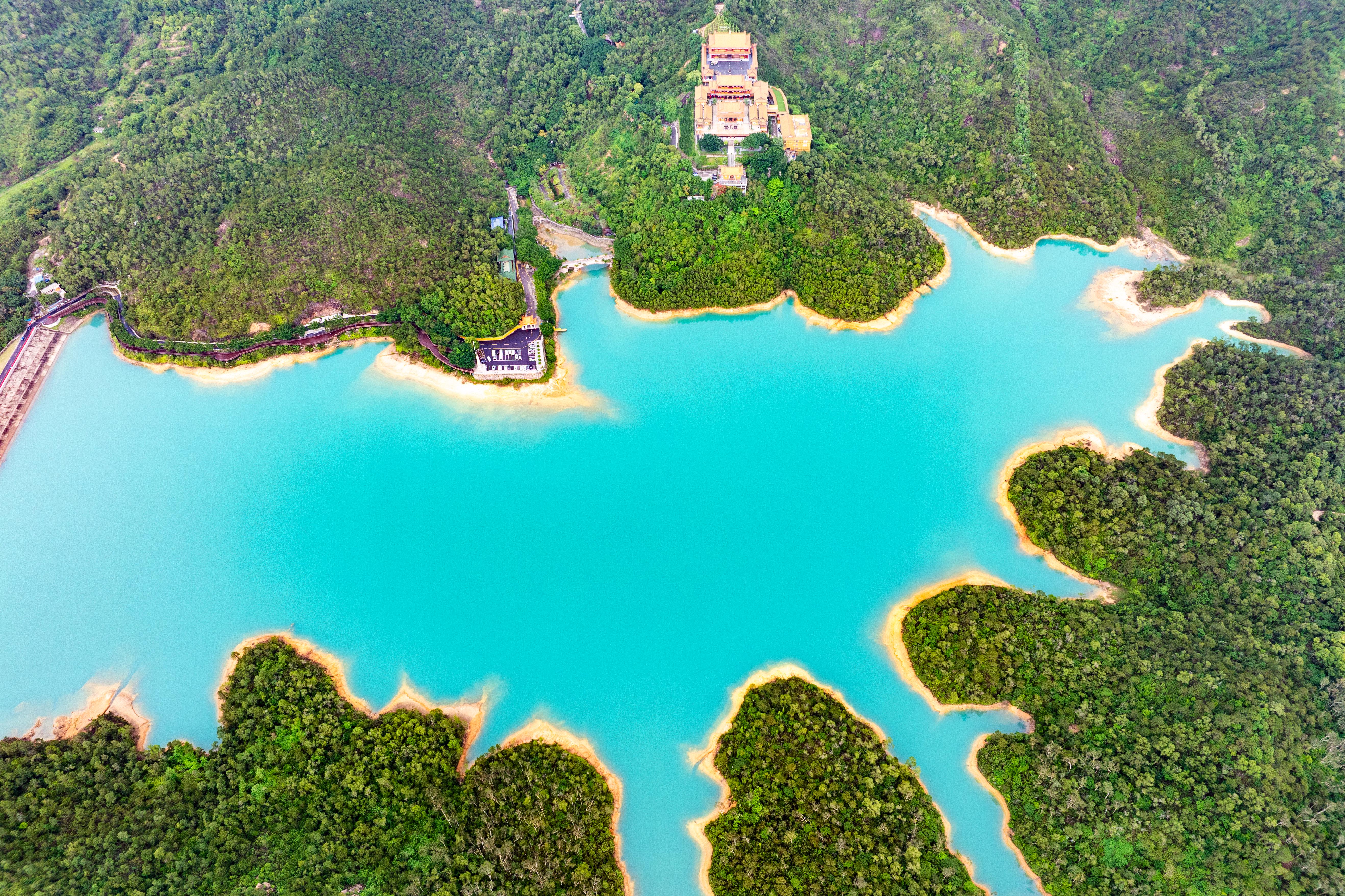 以上图片:2025年5月19日,位于广东省珠海市斗门区莲洲镇黄杨山南麓的金台寺与周边绿水、青山互相映衬,风景如画。(无人机照片)CICPHOTO/黄胜林 摄