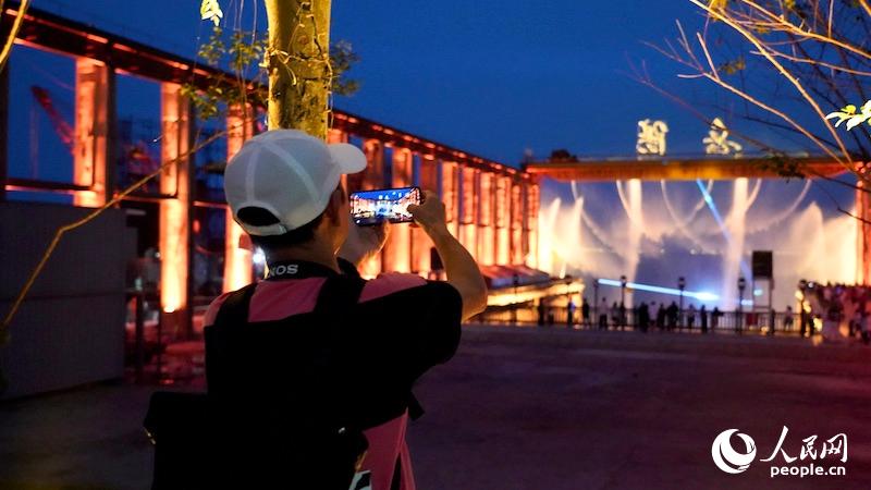 游客被岳阳港灯光秀吸引驻足。人民网记者 吴茜薇摄