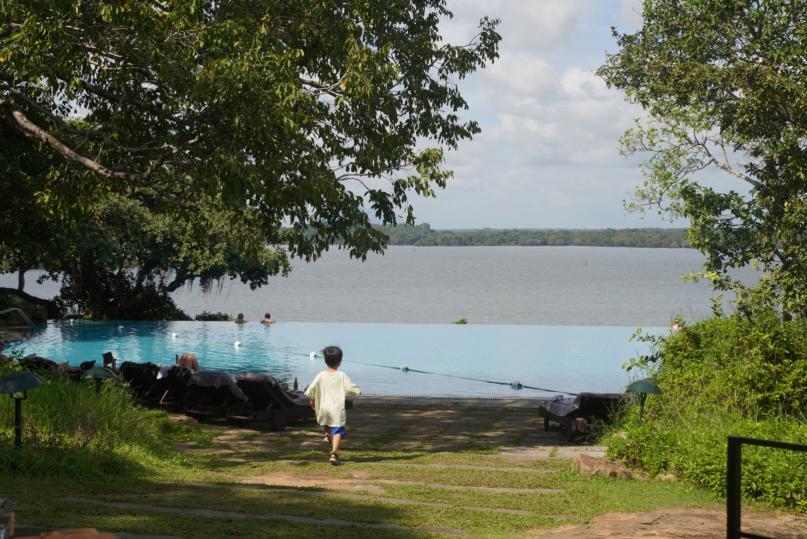 深入酒店,与建筑合二为一的岩壁引导我深入探索。仰起头,悬挑屋檐在湿润的空气中舒展,像某种热带阔叶植物凝固的切片。巴瓦总是以退让的姿态进入自然:粗粝的火山岩基座与蕨类共生,混凝土立柱缠绕着藤萝的静脉,所有直角都被攀援植物啃噬成柔和的弧。傍晚的太阳雨来得像一场即兴的爵士乐,而雨帘穿透挑空大堂的格栅顶棚,在柚木地板上敲出节拍时,我正蜷在悬臂式露台的阴影里。我一错不错地凝视水珠沿钢索滑向无边际水景,那里金属与液体正在进行一场私密的导电实验。