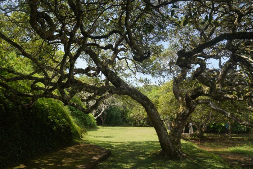 到达Lunuganga Garden的时候已接近晌午,烈日当空,岛上特有的铁木将枝丫的影子刺绣在庄园赭色夯土墙上。在巴瓦历经四十年雕琢的花园中,新古典主义凉亭与野性生长的丛林至今仍在对话。杰弗里·巴瓦的拐杖曾在此处叩击出建筑的原点——这位造梦者把橡胶庄园改造成动态的园林装置,让台阶像脊椎般咬合丘陵的坡度。长期的植物驯化中,柚木与凤凰木在建筑师的纵容下篡改图纸,如今它们的根系已悄然顶起旧时的地砖。