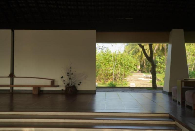 前方Saram House在椰林深处显形。这座为画家设计的居所,竟将一间废旧的荷兰仓库改造成了光影剧场。倾斜的屋顶切割出流动的光带,斑驳的白墙成了天然画布,让人联想到毛姆笔下"面纱"般朦胧的殖民地往事。巴瓦善用光影,投入巴瓦光线的叙事线索中,刚才路上正在升高的焦虑,瞬间就被安抚了。光线的金手指,确有魔力。