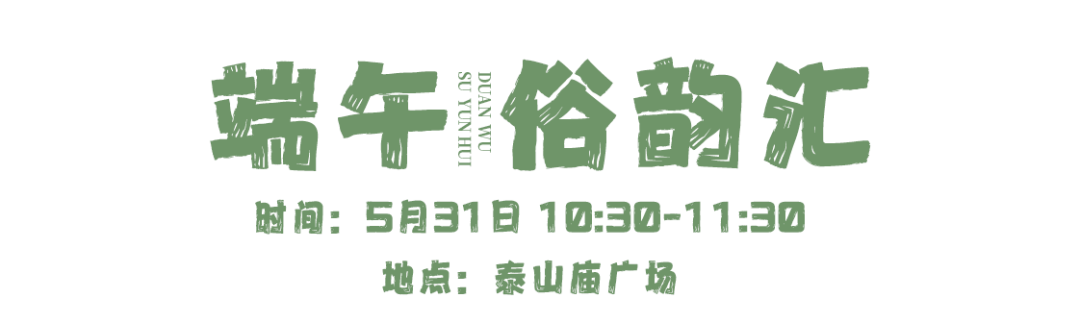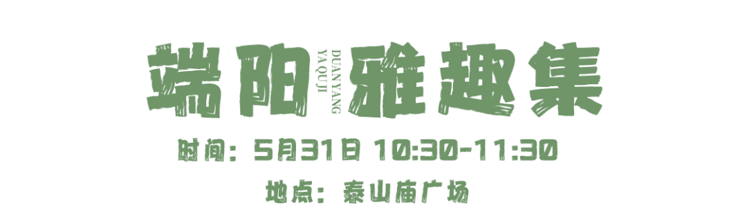 5月31日端午节当天,泰山庙广场的“端阳雅趣集”将热闹开市。沐兰汤、画额、包粽子、品黄酒、佩戴五彩绳,在泰山庙广场体验独属于端午节的仪式感~