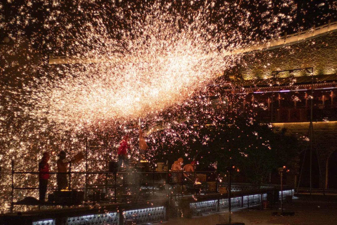 夜幕降临,好戏正在开场!“唐风晋韵”火流星划破黑暗,风火轮旋转成光晕,舞龙者赤膊上阵,龙身裹挟火星游走如星河奔涌。