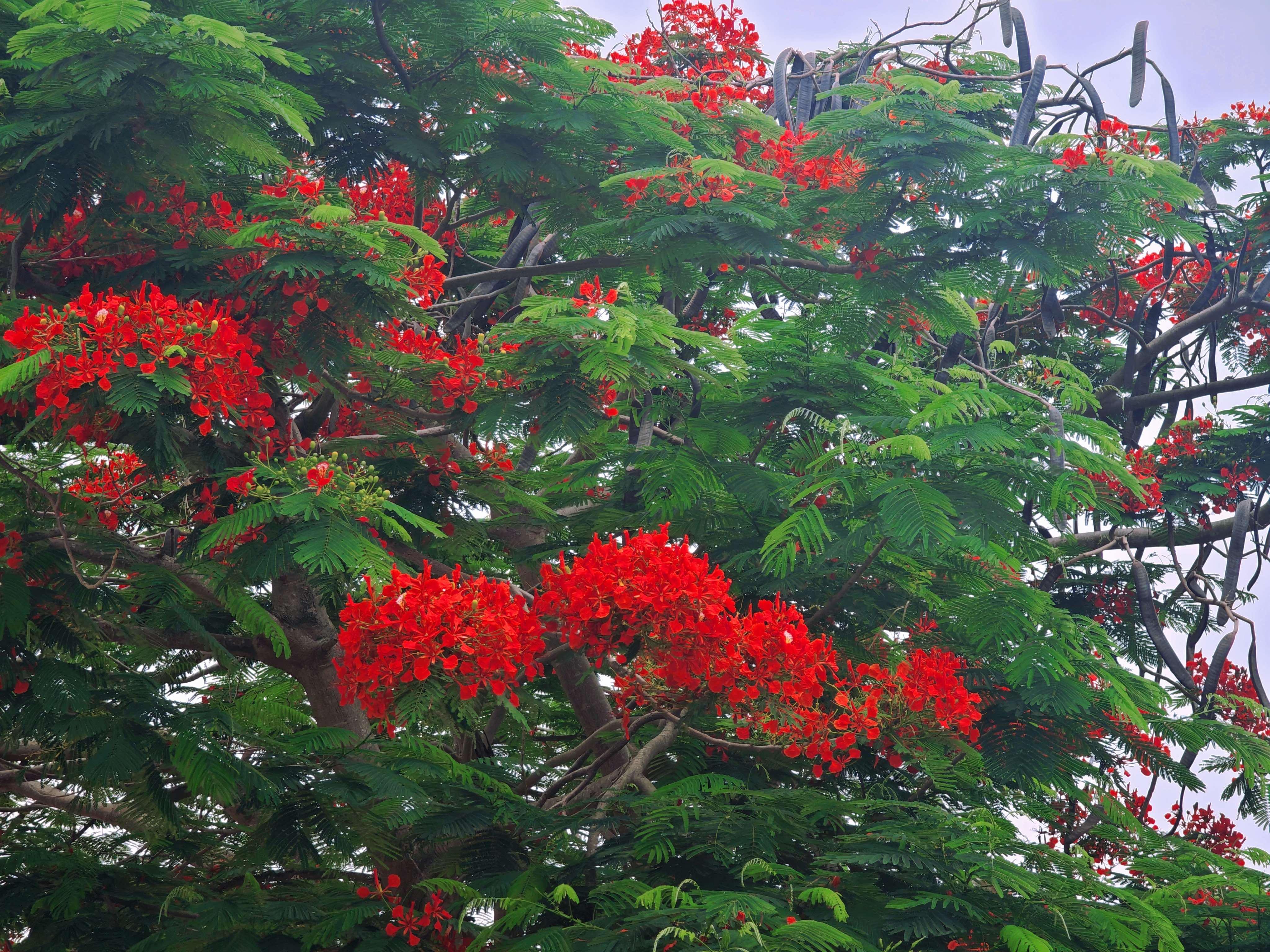 海边不远处的公路上,凤凰花开正好,用火红点缀海陵岛的深蓝。人民网 朴馨语摄