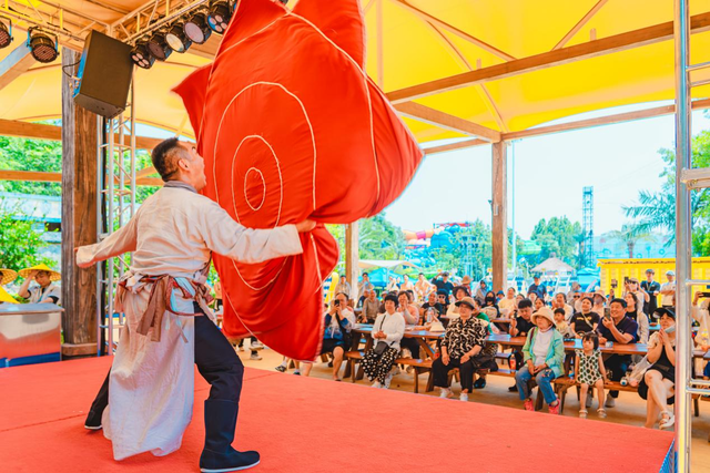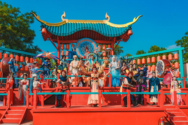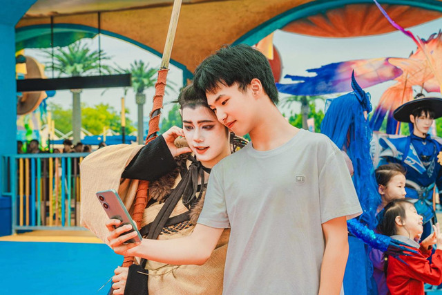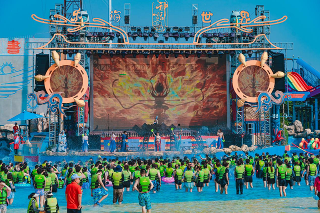 园区通过300余场主题演艺、100余组顶尖玩水设备及沉浸式场景还原,将神话故事转化为可触可感的互动体验:游客既可在万平米级巨型造浪池体验"彩虹滑道""电音狂欢"等热门娱水项目,又能与月老、哪吒、白蛇等百余名神话NPC邂逅,参与"神仙巡游""鱼龙舞""敦煌飞天"等剧情化国风演艺互动。游客刘女士体验后表示:"演员会主动邀请游客参与其中,随地开演非常有趣,让神话人物也‘活’了起来。"