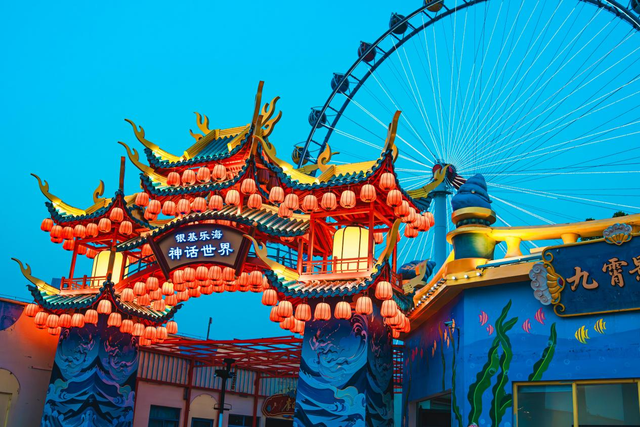 作为银基度假区年度重点文旅项目,乐海神话世界——这座中国神话主题沉浸式体验乐园,以《封神榜》《西游记》等经典IP为蓝本,构建起"东海仙境""奇幻珊瑚岛""风火轮广场"等五大主题区,总占地面积达18万平方米。