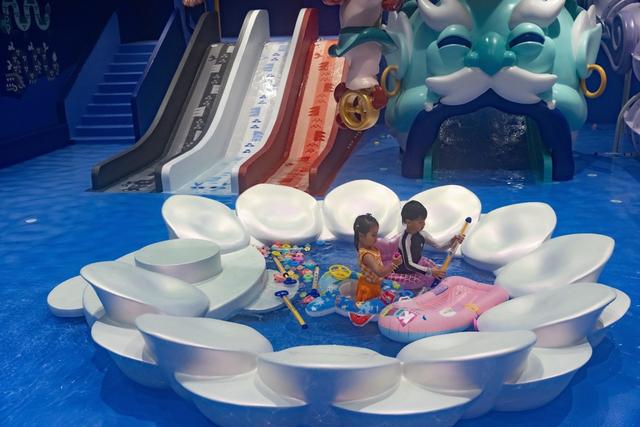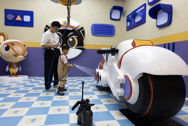 “九色鹿区”被打造成有敦煌美学的“公主房”,可以化妆、换衣服、玩棉花娃娃等。在“舒克和贝塔”区,可以与舒克比赛开飞机游戏,认识生活中常见的五金工具。在“黑猫警长区”的森林警局洗车房里,可以体验洗车游戏。“哪吒闹海区”是水上乐园,游玩设施里藏着四海龙王的形象。挖沙区域则结合《阿凡提的故事》,沙堆中藏有带芯片的道具,孩子们可以帮助阿凡提一起打败巴依老爷。“天书奇谭区”打造了静态阅读空间,喜欢读书的孩子可以在里面安静阅读绘本。