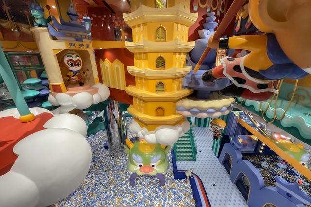 包含两层空间的“大闹天宫”区最为宏伟壮观,孩子们可以从海洋球组成的海底龙宫里沿着如意金箍棒向上攀爬至二楼天宫,电影中的经典元素如凌霄殿、南天门、炼丹炉等都被还原搭建出来。