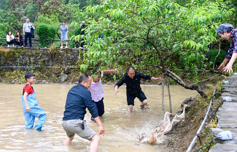 5月31日,游客在重庆市酉阳土家族苗族自治县桃花源景区参与“捉鸭子”游戏。当日是端午节,各地群众以多种方式欢度假期。 新华社发(邱洪斌摄)