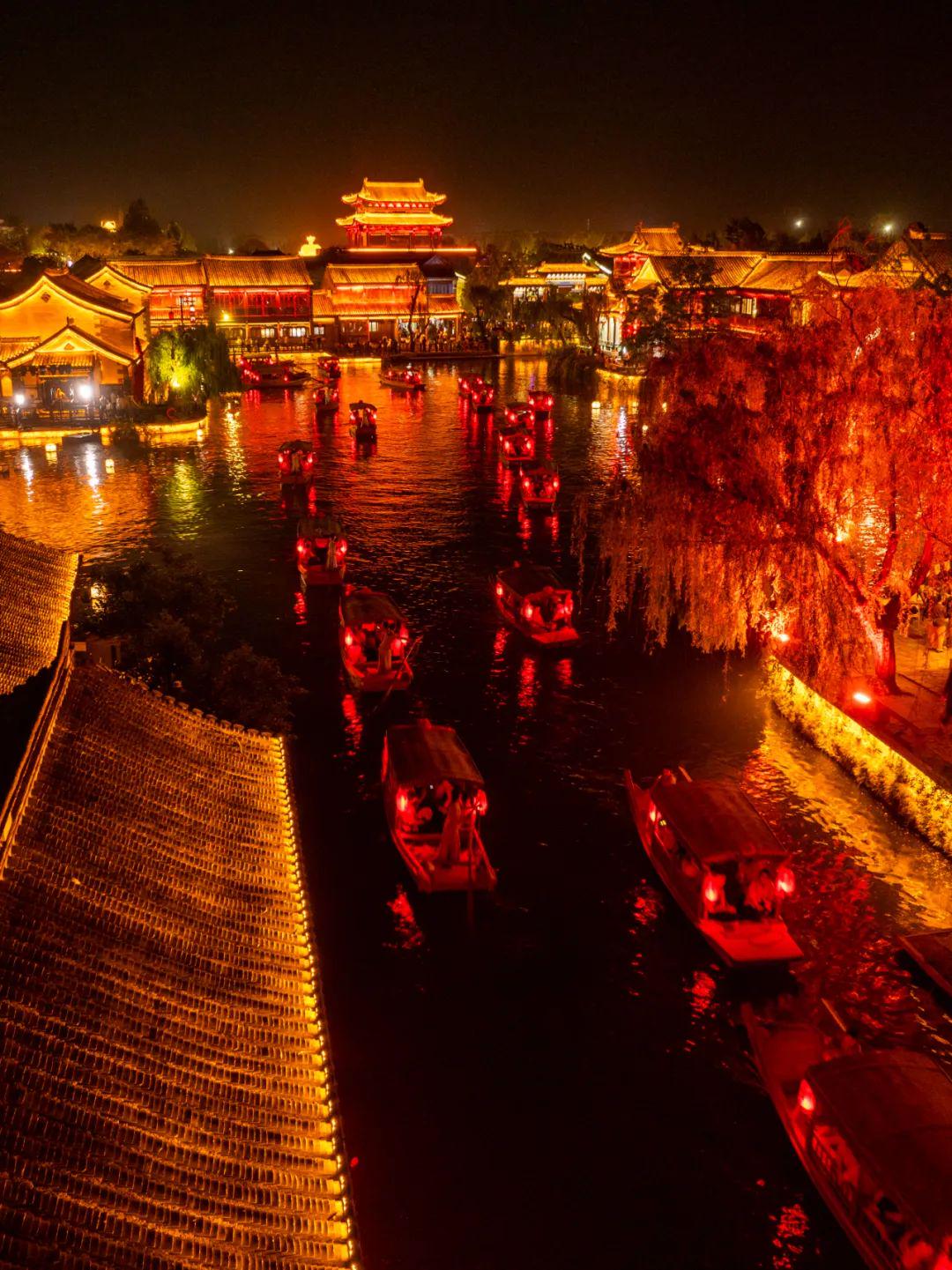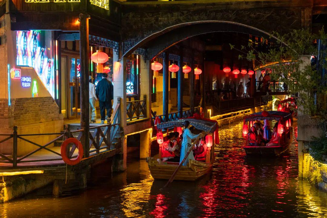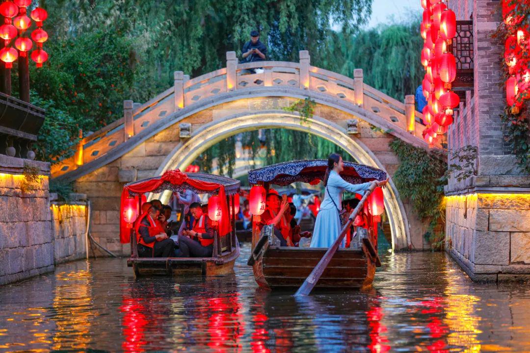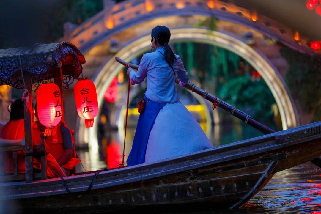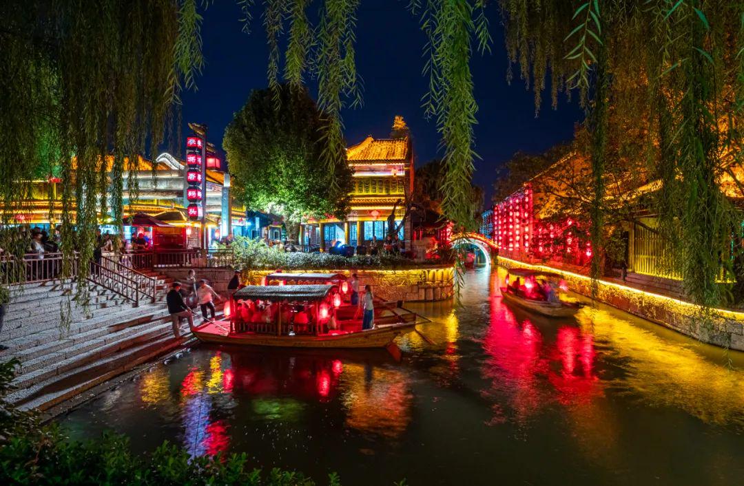 夜幕低垂,古城宛如一颗璀璨的夜明珠,在古运河畔悄然绽放。登上挂满红灯笼的摇橹船,任由木桨轻点,在水巷中悠然穿梭。船妹子的鲁南小调在耳畔回荡,让整个夜色都多了一份婉转与柔情。