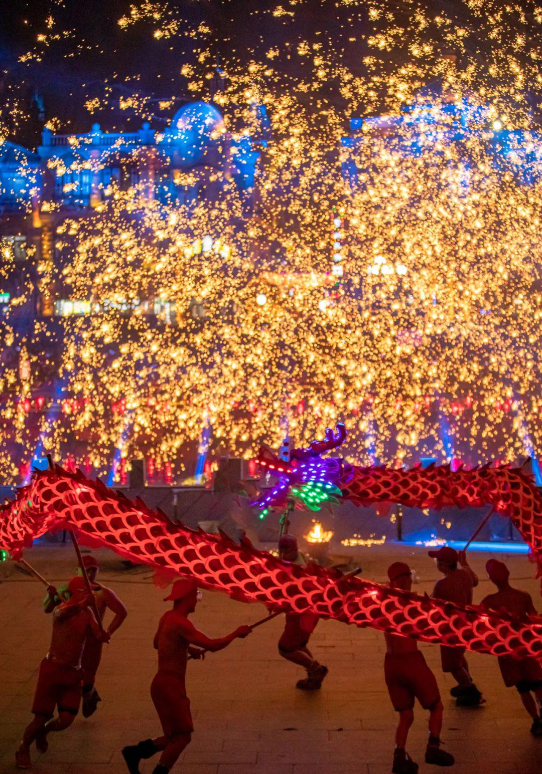 “火龙钢花”每晚在复兴广场震撼上演,这项首批国家级非物质文化遗产已传承千年。千度高温的铁水被击打成绚丽的钢花,在夜空中绽放出耀眼的光芒,似流星划过天际。