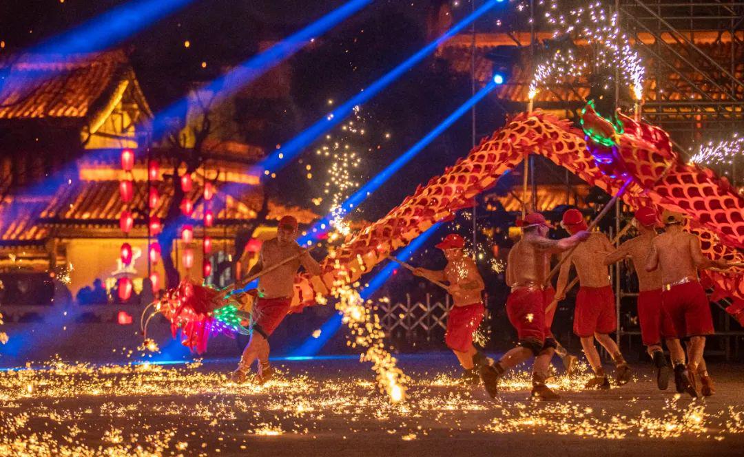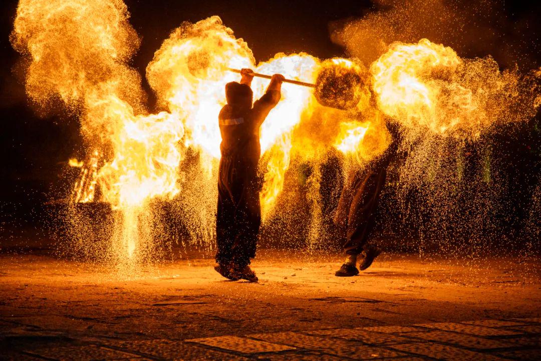 赤膊上阵的舞龙者在火雨中穿梭跳跃,红色巨龙在他们手中腾跃翻飞,宛如一条真龙在火海中翱翔。观众们在安全距离外屏息凝视,那一刻,时间仿佛静止,只剩下这震撼人心的视觉奇观。