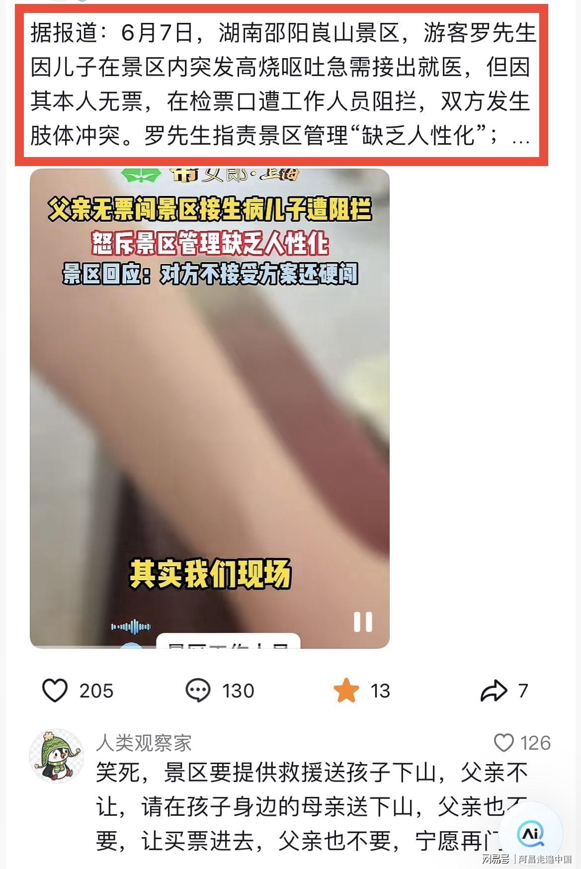 2025年6月7日,湖南邵阳崀山风景区,一名男子带家人来旅游,两女一男带着3个孩童来景区旅游,然后两位女士带着3个孩子进入景区正常购门票入园,男子在停车场没有进景区,当其中一个孩子在景区里面发生高烧呕吐,改名男子是孩子父亲,说要进景区被孩子下山送孩子去医院。