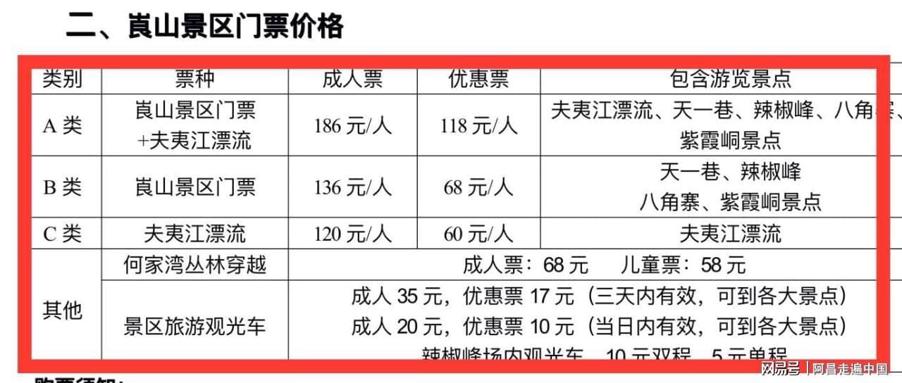 1、A类 :崀山景区门票+夫夷江漂流,(全票 186元人),(半票 118元),主要包含景点,夫夷江漂流、天一巷、辣椒峰、八角寨