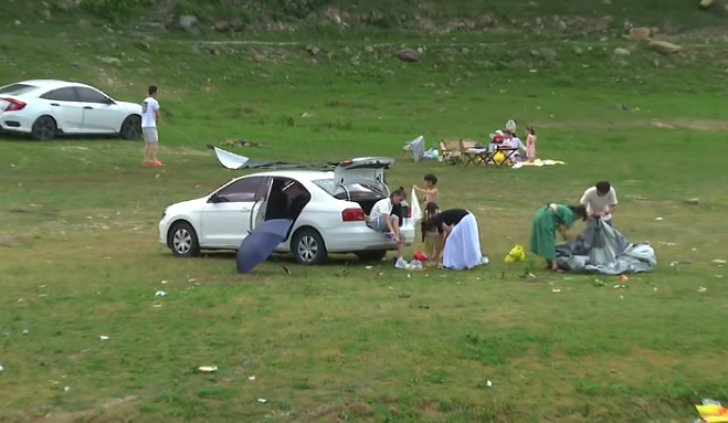 记者实地走访发现,度尾圳口水库“草原”区域已成为露营聚集地。帐篷、野餐垫错落分布,但食品包装袋、饮料瓶等垃圾随意丢弃在草丛间,与周边美景形成刺眼反差。市民林先生对此表示不满:“路口明明设置了垃圾桶和垃圾场,部分游客却不愿多走几步带走垃圾,破坏环境不说,也影响其他人的游玩体验。”