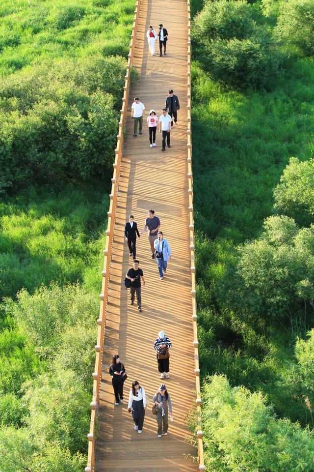 湿地公园内的木栈道,游客在漫步观赏美景。