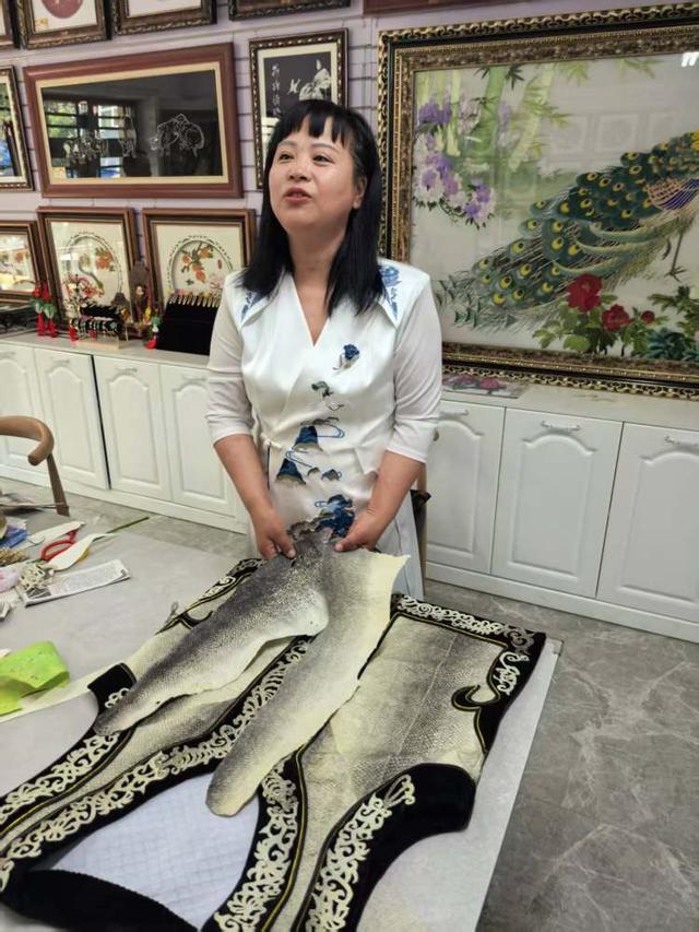 省级非遗代表性传承人杨双艳的工作室,就正在制作一件鱼皮马甲。她巧手制成的鱼皮马甲可以卖到7000多元,而一条设计精美的鱼皮裙更是卖到3万多元。如今,她带领村民一起干,成为当地增收的新亮点。