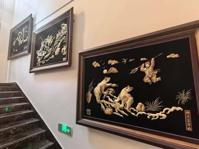 讲解员崔柳介绍,最大一幅《九龙壁》鱼皮画长8米,是6位非遗代表性传承人、2位工艺美术大师,花了半年才制作完成。