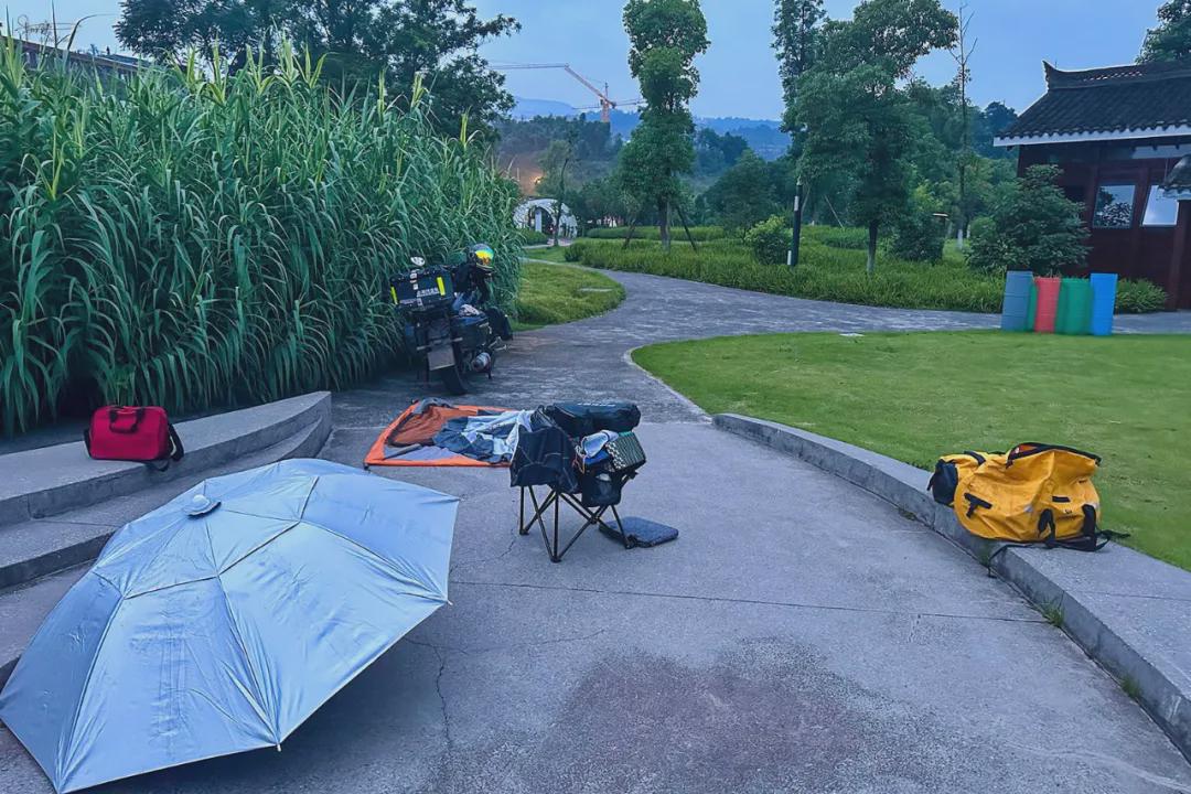 几经辗转,一不小心就在青衣江两边的各个公园里绕了两圈半,最后才选定这个稍显偏僻的角落,几米开外就是公厕,还有插座可以取电。有趣的是附近应该还有好几个摩友在露营,因为天黑后不断有人到厕所里洗漱(跟其中一个聊过几句),可见他们的位置比我挑得还要隐蔽。需要说明的是,我在搭帐篷前是跟附近的保安确认过,得到肯定的答案才敢在此扎营的。