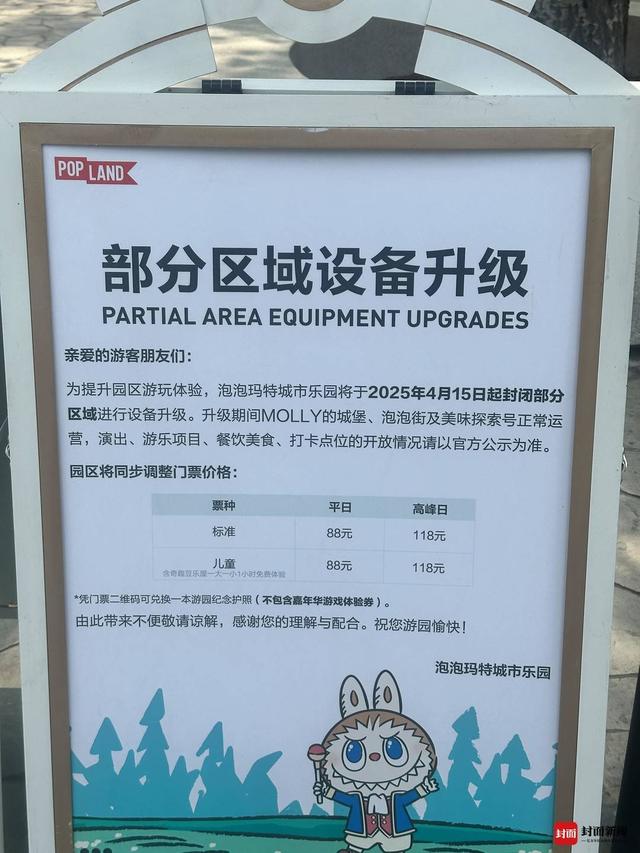 现场相关工作人员介绍,泡泡玛特城市乐园按照空间分为四大核心区域。目前,乐园正在对约三分之二的区域进行重新规划设计,二期工程也在同步设计中。“我们会特别提醒游客,现在暂时不能体验所有的项目。”据悉,自4月15日起园区封闭部分区域后,门票价格也相应下调:平日票从150元降至88元,高峰日从180元降至118元。