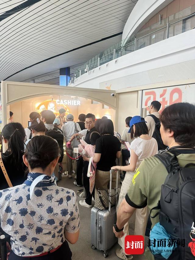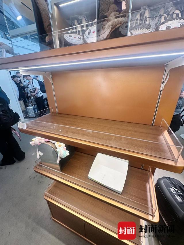 有趣的是,对于暂时无法亲临乐园的人来说,北京大兴国际机场提供了一个购买“乐园限定”的窗口。在位于机场候机厅2楼A区的泡泡玛特店铺,虽然货架略显空旷,不少商品已售罄,但推着行李箱的游客热情不减。