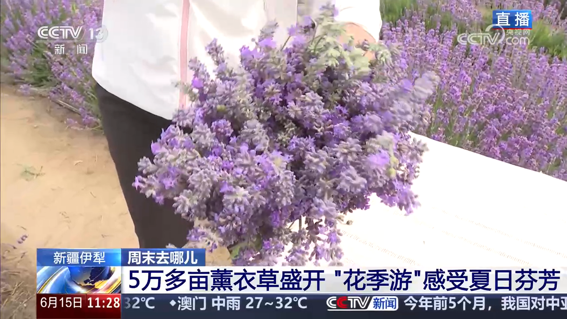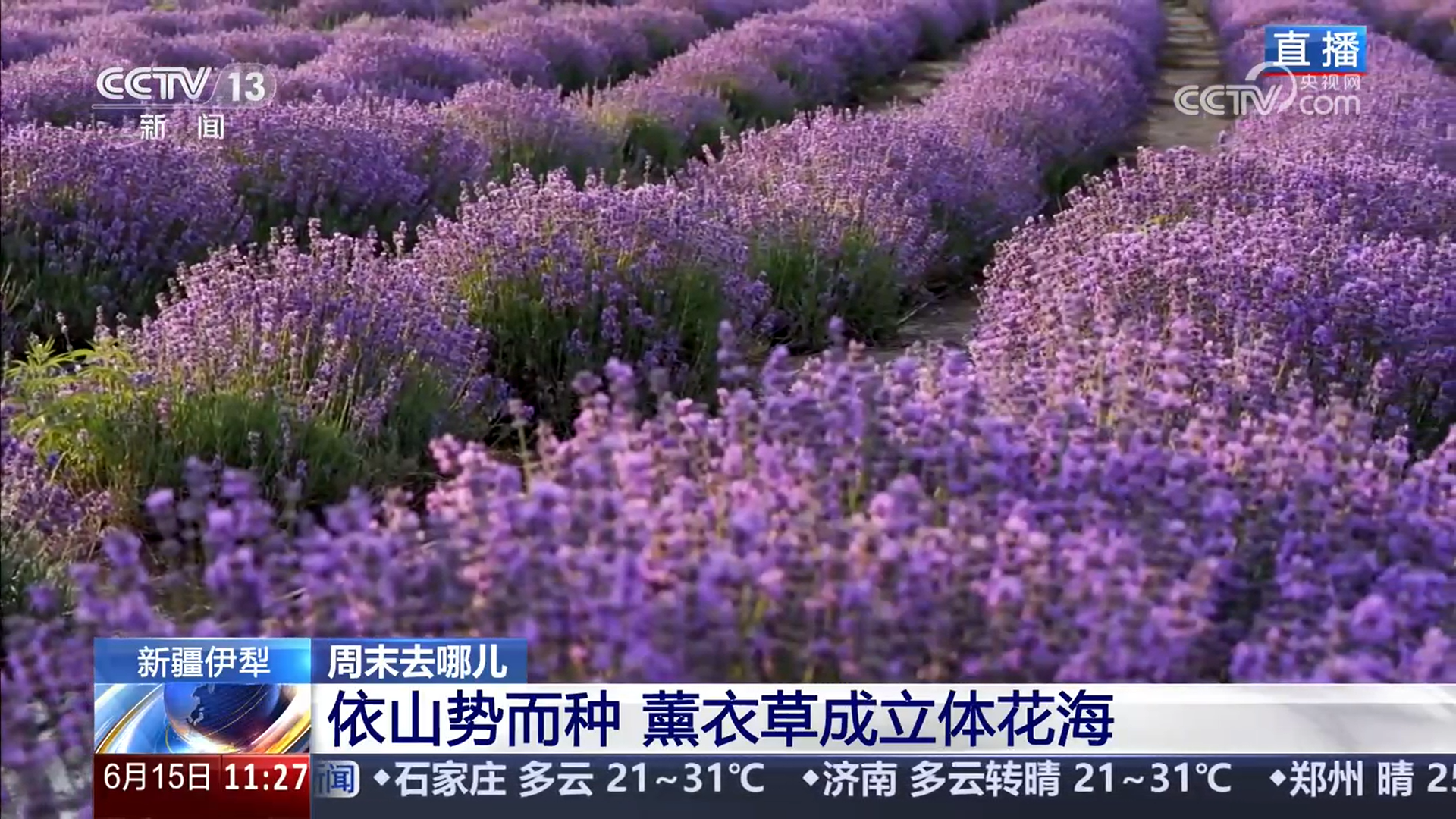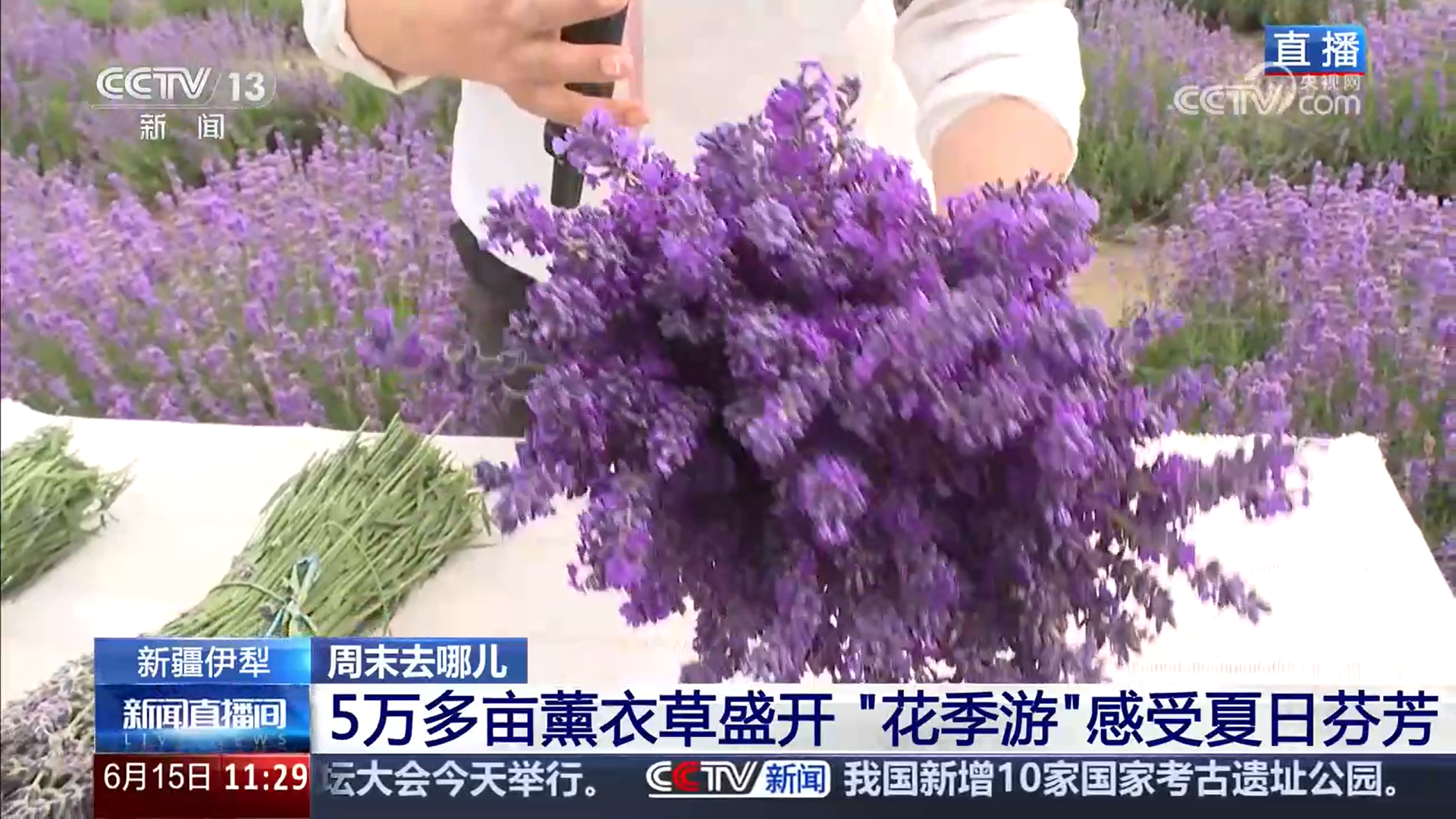 总台记者崔宁:我现在是在霍城县芦草沟镇元宝村,这一片薰衣草面积大约有1.2万亩。站在这儿,空气中有非常浓郁的薰衣草特有的芳香。放眼望去,满眼都是紫色。看我身后,远处的田野、绵延的西天山与大片薰衣草连为一体,唯美又大气,感觉就像在画里一样。它不是一马平川的花海,因为这里之前是一片荒山荒坡,所以薰衣草也是依照这些山坡、沟谷的自然走势种植的,形成了一片片薰衣草花的梯田、蜿蜒流淌的花河,从空中看起来非常的立体。对游客来说,这种高低错落的花海也会让大家的体验感更好。可以说,在当地,薰衣草开花就是一个“信号”,同步开启了当地夏季旅游的高峰期。