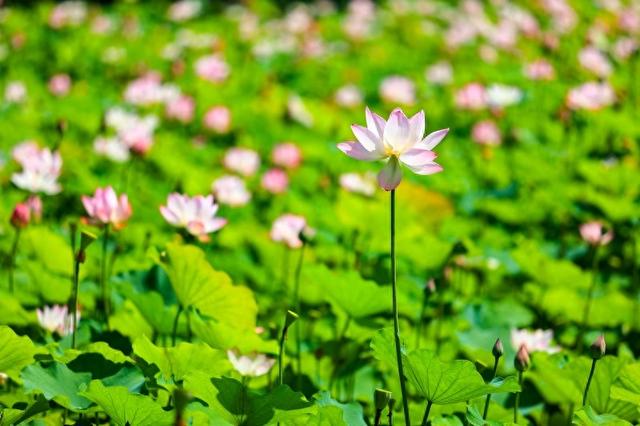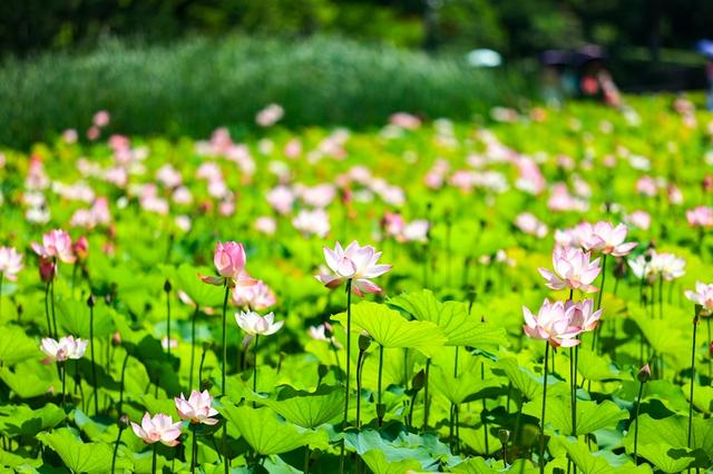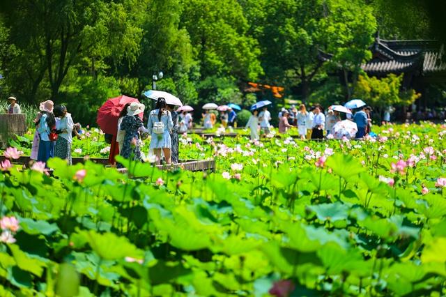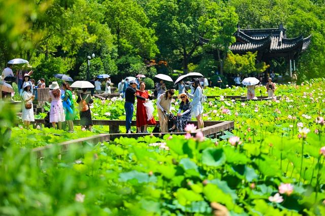 2025年6月17日,夏日时节,浙江杭州萧山湘湖荷花庄荷花盛放,碧叶田田、粉荷点缀。栈道上游客漫步赏景,古建与荷田相映成趣,成为市民游客赏荷的热门打卡处 。(未经授权,请勿转载)