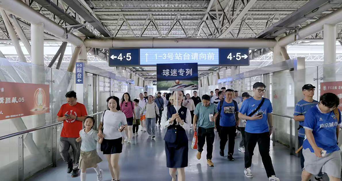 6月14日,铁路部门开行南京站往返淮安东站的长三角首趟“苏超”球迷高铁专列,方便球迷前往目的地观赛。